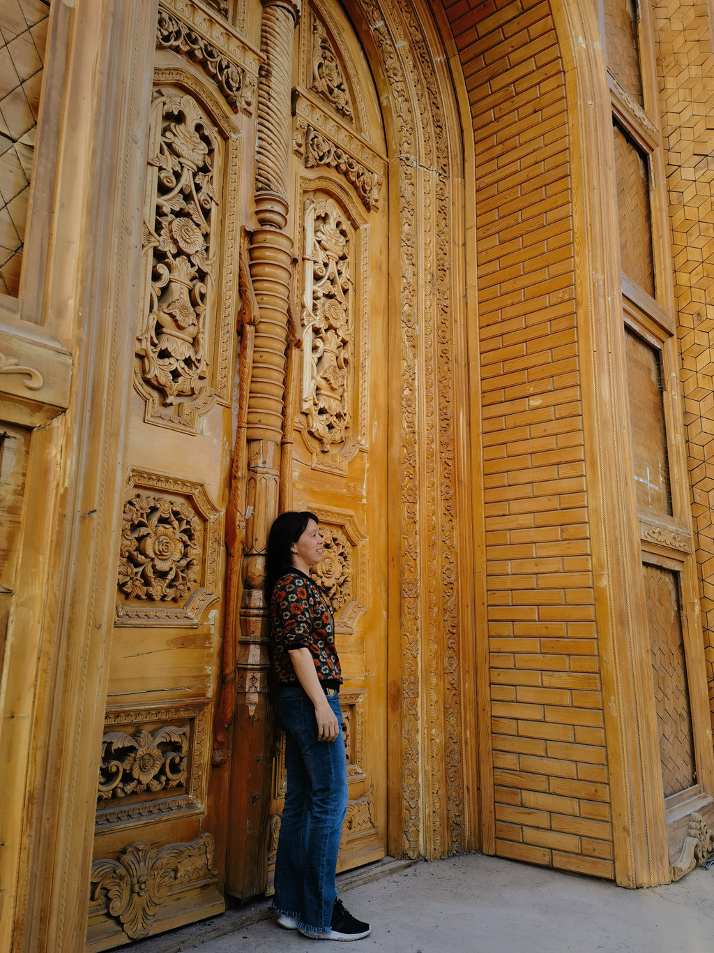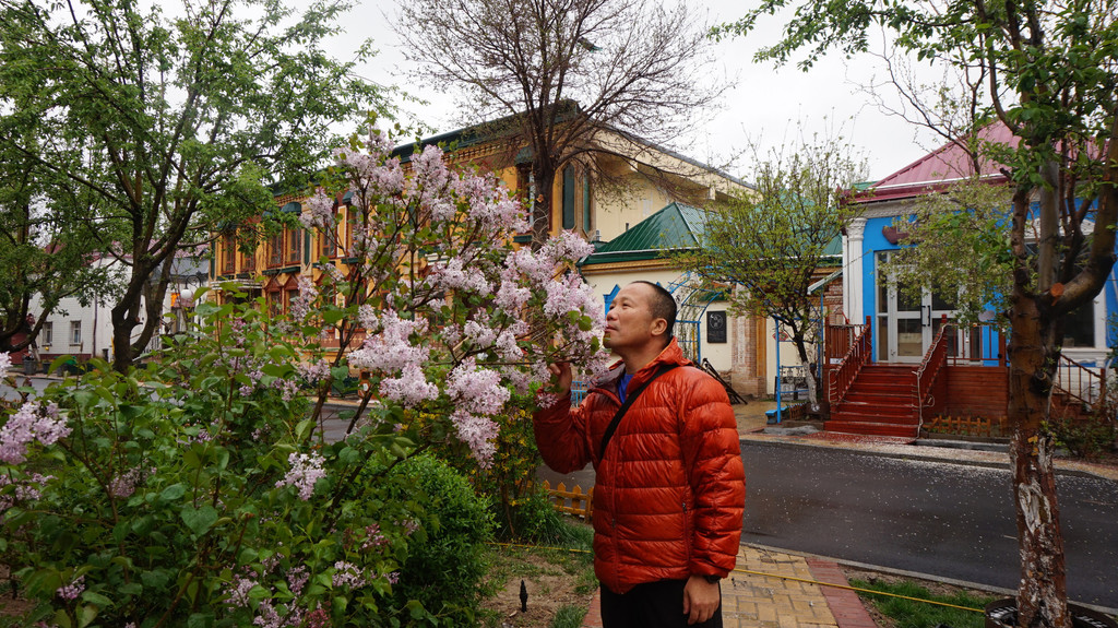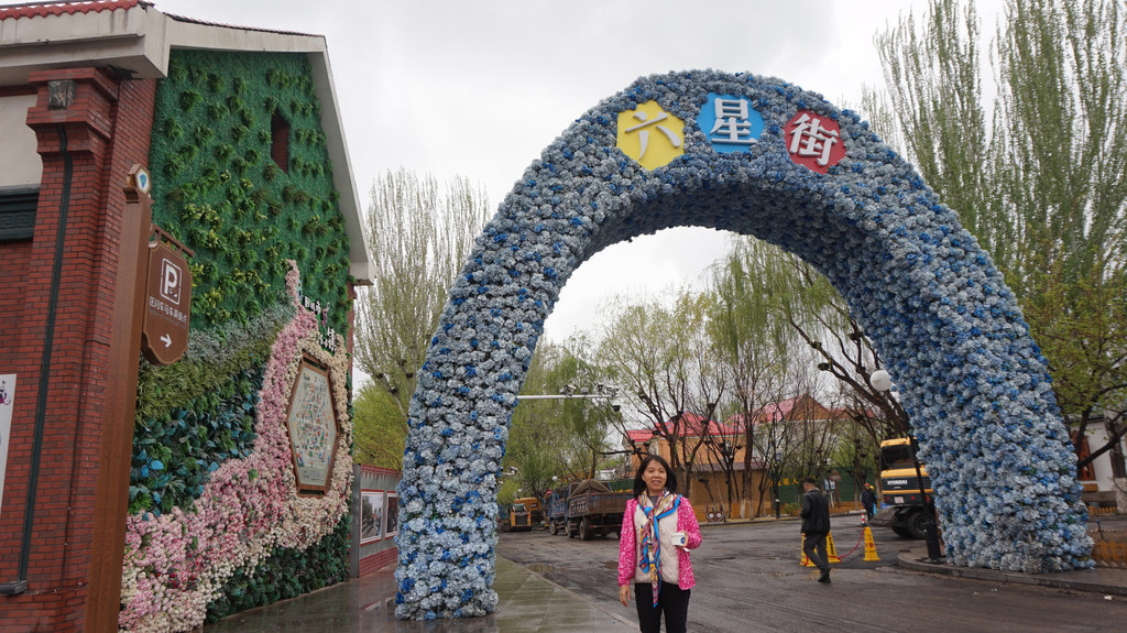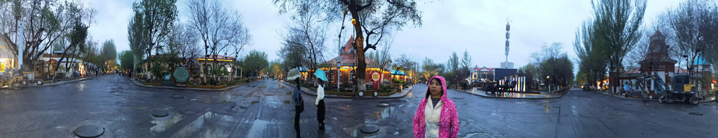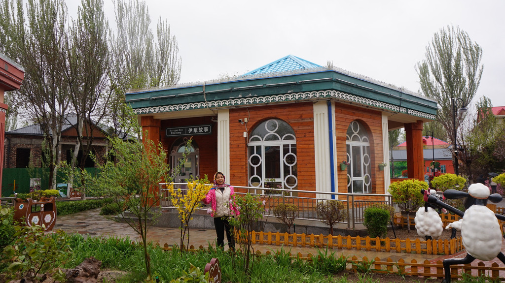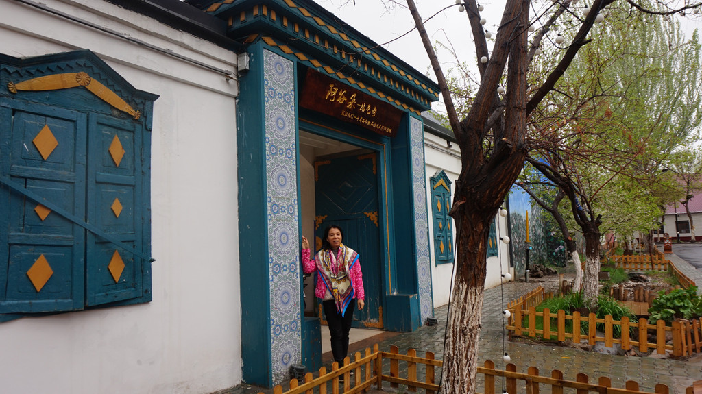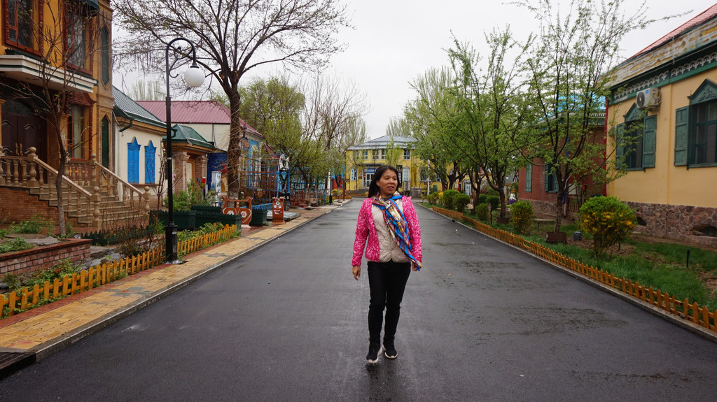 我们进入街区,此时的街区正在大范围维修,以迎接五一这即将来临的旅游旺季,所以路面显得有的破烂,但周边的建筑却非常有特色。街区有六条主干道从中心向外辐射,把街区分成六个扇形地区,各式民族庭院和民居,沿着放射性的街道在环形扩散模式下依次布置井然有序。有欧式风格的尖顶小阁楼,也有浓郁伊斯兰风格的半弓形窗棂,还有俄罗斯铁皮尖顶木屋门廊,还有维族风格木雕、石雕浮板及各式铁艺门廊等。这里似是城市中的一处展览中心,展示着各类浓缩的特色街景建筑以及民俗文化生活场。