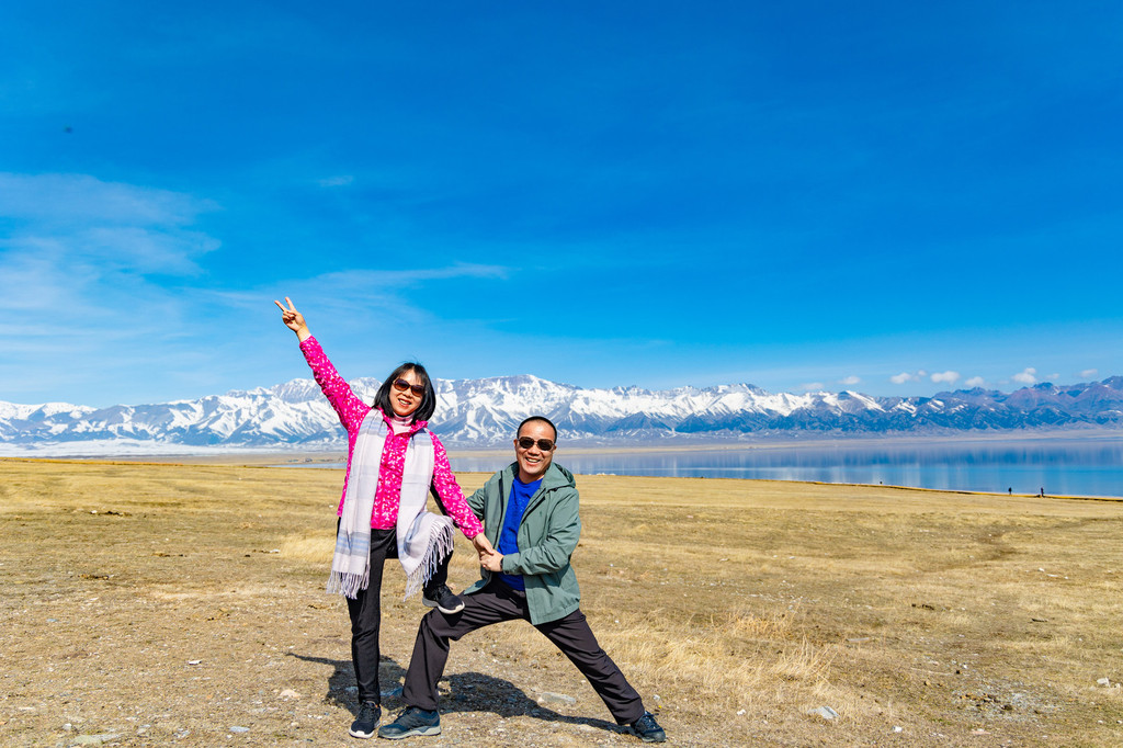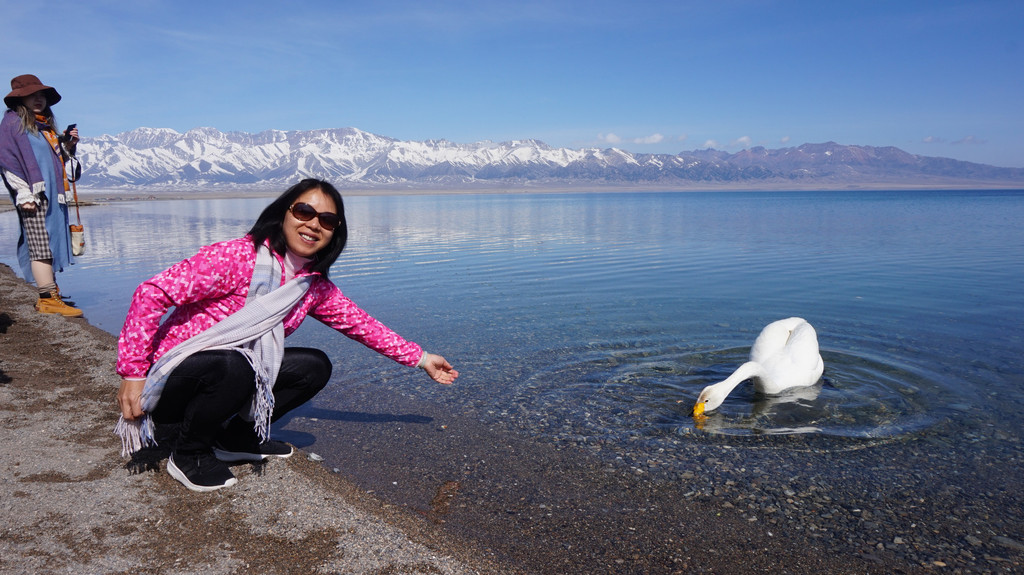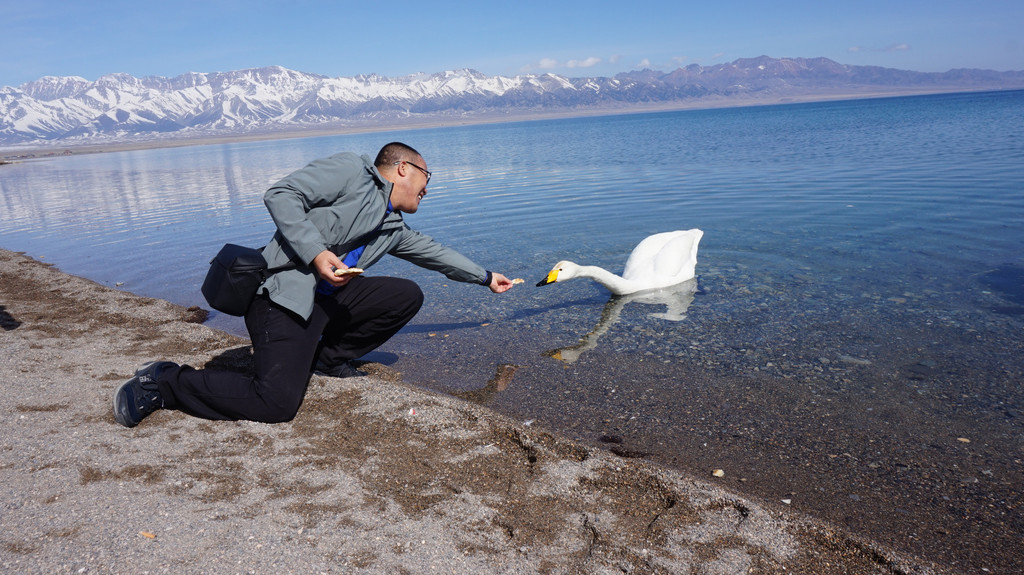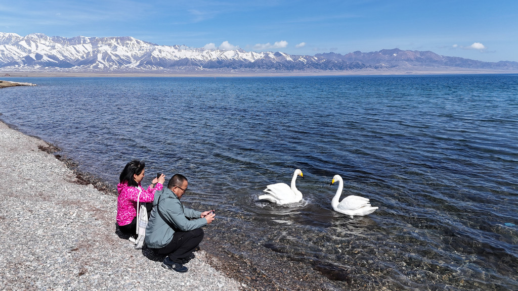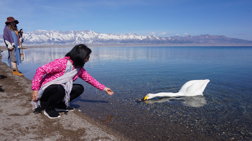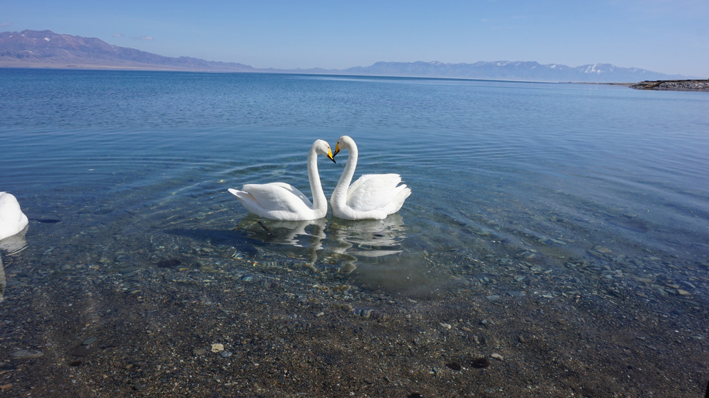 在南侧辽阔的草原边,万里冰封的赛里木湖,却给在这过冬的天鹅留了一块过冬的领地,一湖碧蓝的湖水呈现在我们眼前,成群的天鹅在这里嬉戏。雪白的天鹅、碧蓝的湖水、对岸连绵起伏的雪山、蔚蓝的天空形成了一幅绝美的画面,我们置身其中,恍若进入仙境。与天鹅的亲密接触,体验着人与自然和谐相处。