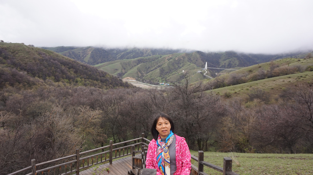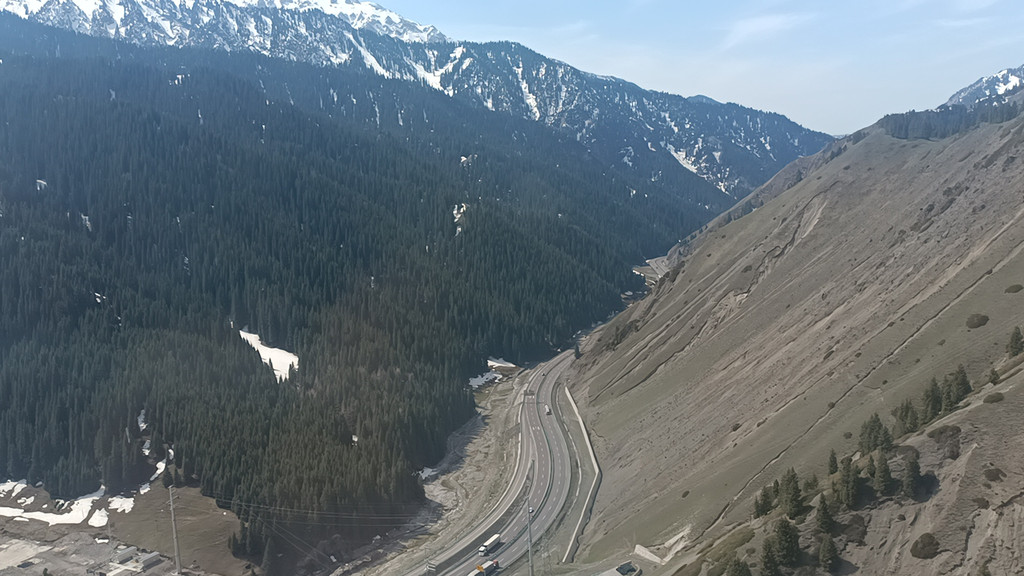 我们的大巴车行驶在果子沟大桥上,虽不能停车,但是透过车窗依然可以纵览果子沟全貌,远处白雪皑皑的雪山、山坡上郁郁葱葱的雪杉、崇山峻岭之间、蓝天白云之下的果子沟美若仙境。