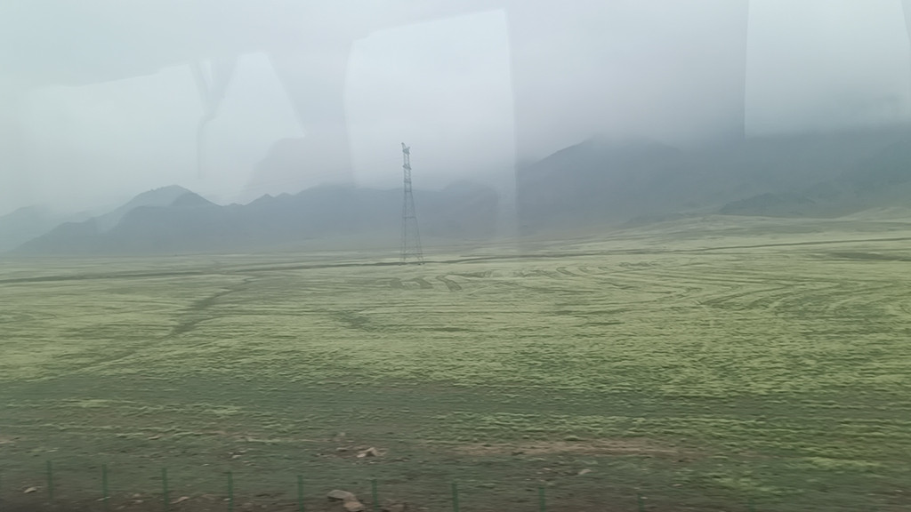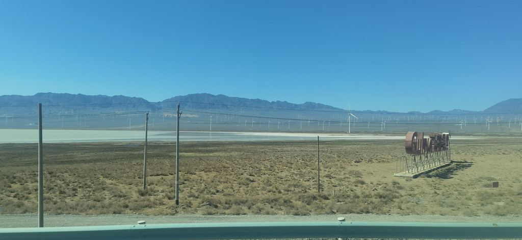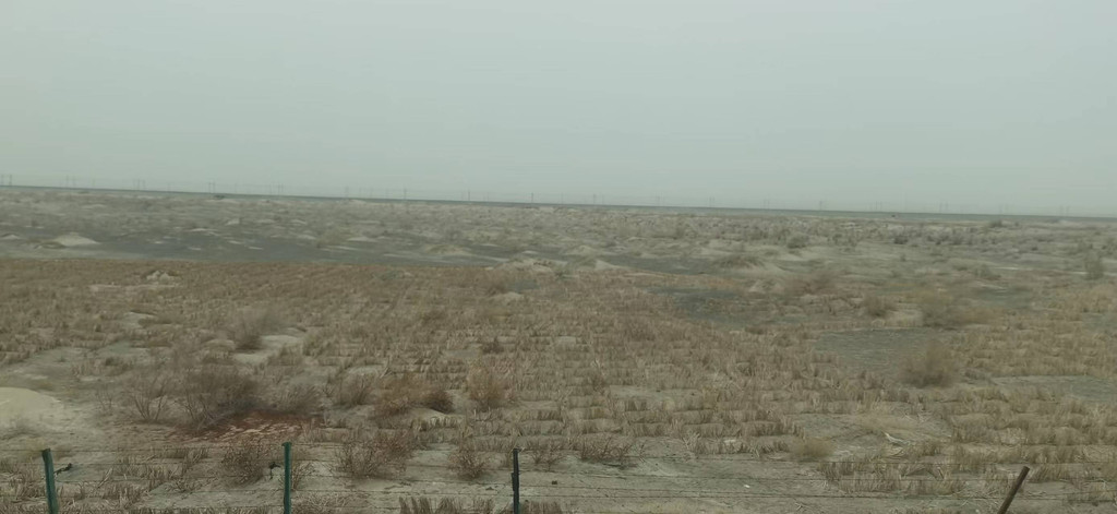 沿途可见当地用植草格来治理沙漠,防止沙漠侵蚀到公路铁路上,很多种了植草格的地方都长出了植物,有效地解决了沙漠扩大化问题