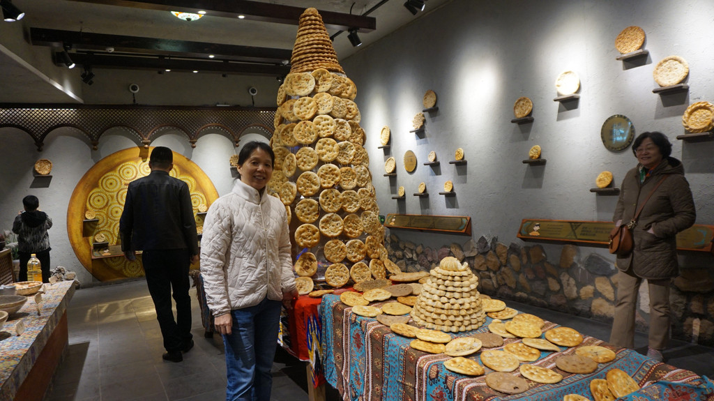 从古至今,制作馕的原材料变化不大,包括小麦粉、菜籽油、皮芽子、食盐、芝麻、白糖、孜然、茴香、玫瑰、鸡蛋等,根据不同地区人们的习惯,添加羊油制成油馕,添加羊肉丁制成肉馕,手工精细,口感细腻,金黄色,中间薄,边沿略厚,表面戳有许多花纹。参观完展厅,沿楼梯走下,还有品尝区、互动区、销售区,买了几个特色馕,就让朋友送我们回酒店,准备明天要赶早上路开始充满惊喜的新疆之旅。