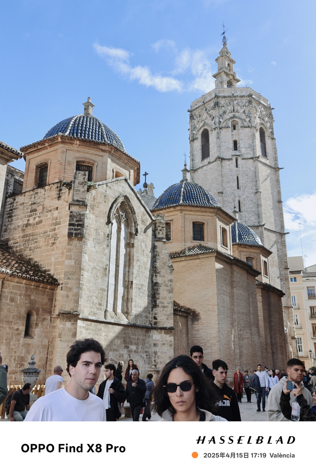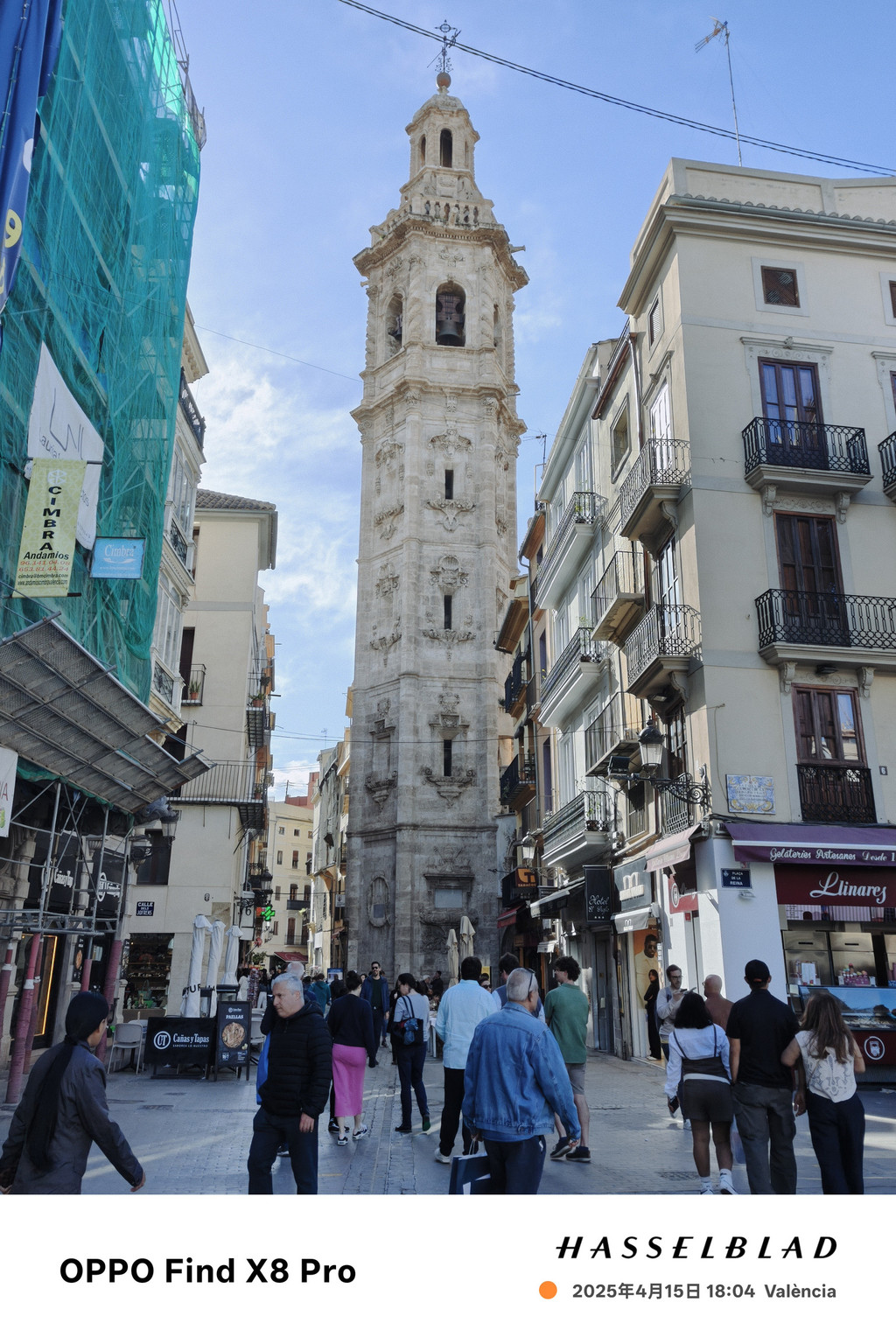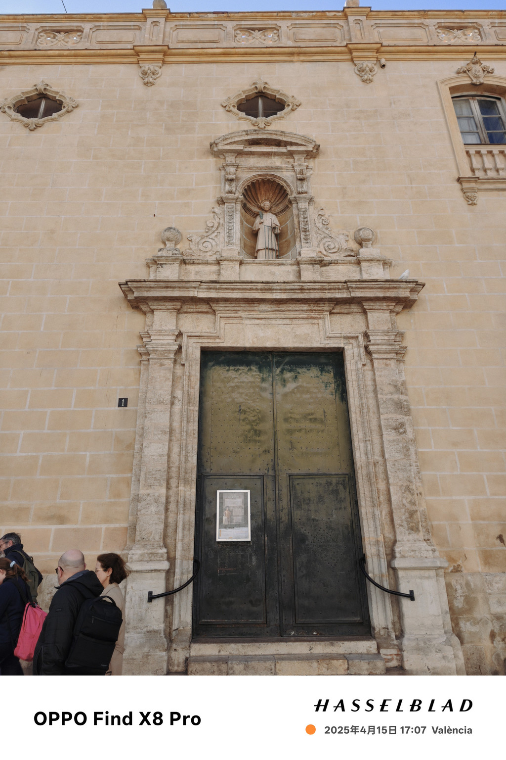紧邻圣女广场的瓦伦西亚大教堂始建于1262年,建造历时近两个世纪并在后续五个世纪中经历多次扩建与修葺,形成了以哥特式为主体的多元混合建筑风格。其原址先后为罗马时期月神庙、阿拉伯清真寺所在地,现存建筑群包含巴洛克式西立面、罗马式南门及哥特式主体结构 。教堂内珍藏的玛瑙杯被认定为耶稣最后晚餐使用的圣杯,该圣物的真实性已获梵蒂冈认可。教堂标志性建筑米格雷特钟楼为未完工的八角形哥特式塔楼,现已成为瓦伦西亚城市象征 。作为西班牙重要宗教文化遗产,该教堂通过定期弥撒、音乐会等文化活动持续发挥宗教与社会功能 。由于是收费景点,我们未能入内参观,只是在外面拍照留念。