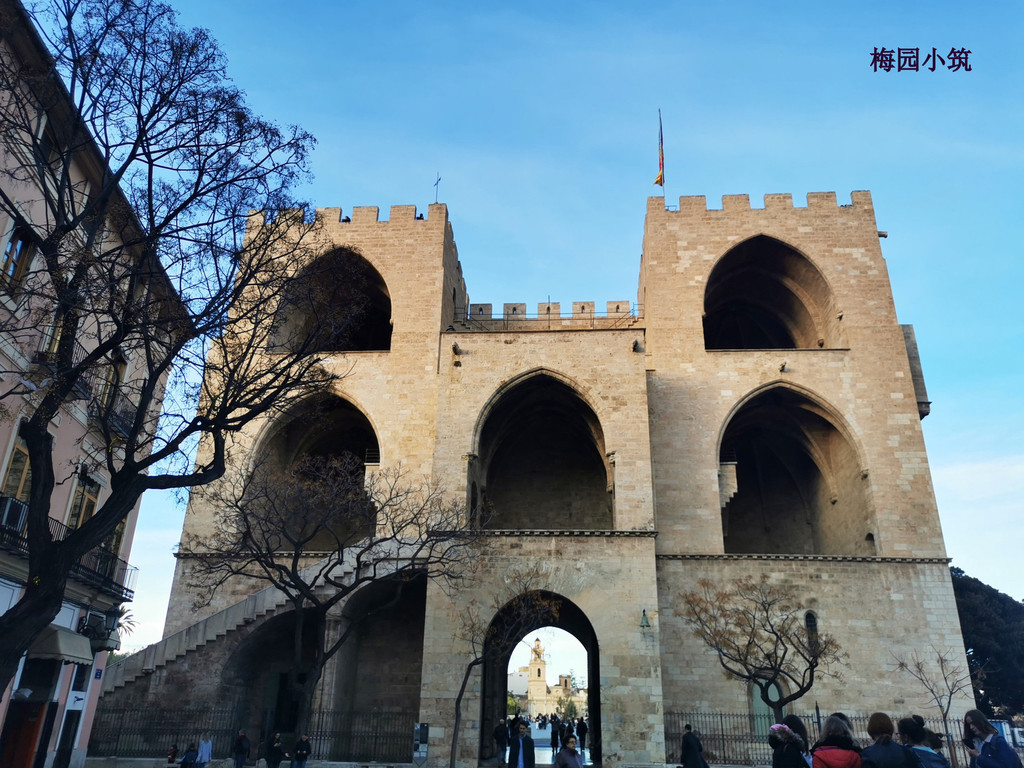 从主座教堂出来,沿着瓦伦西亚老城区的石板路慢慢走,远远就看到了塞拉诺斯门雄伟的身影。两座高耸的五边形塔楼矗立在蓝天之下,厚重的石灰石墙壁散发着历史的气息。走近时,才明白,不能不仰望的宏伟的规模还颇有些所震撼——这座建于14世纪的城门,曾经是瓦伦西亚最重要的防御工事之一。