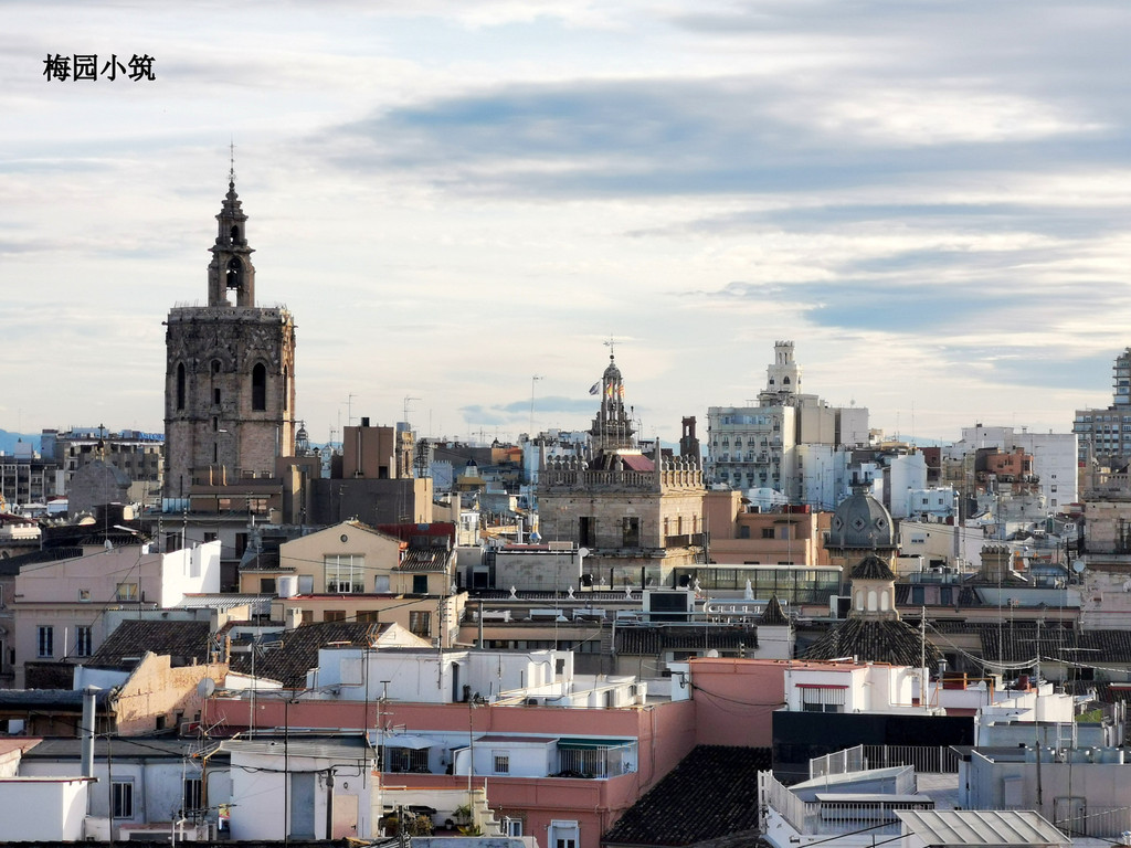 在红瓦屋顶之间,可以看到许多著名的历史建筑,如瓦伦西亚大教堂(Valencia Cathedral)、圣卡塔利娜教堂(Iglesia de Santa Catalina)和丝绸交易所(La Lonja de la Seda)。这些建筑展现了瓦伦西亚丰富的历史和文化。在更远的地方,现代化的建筑与老城区的传统风貌形成鲜明对比。你可以看到艺术科学城(Ciudad de las Artes y las Ciencias)的独特轮廓,感受到瓦伦西亚作为一座古今交融的城市的魅力。