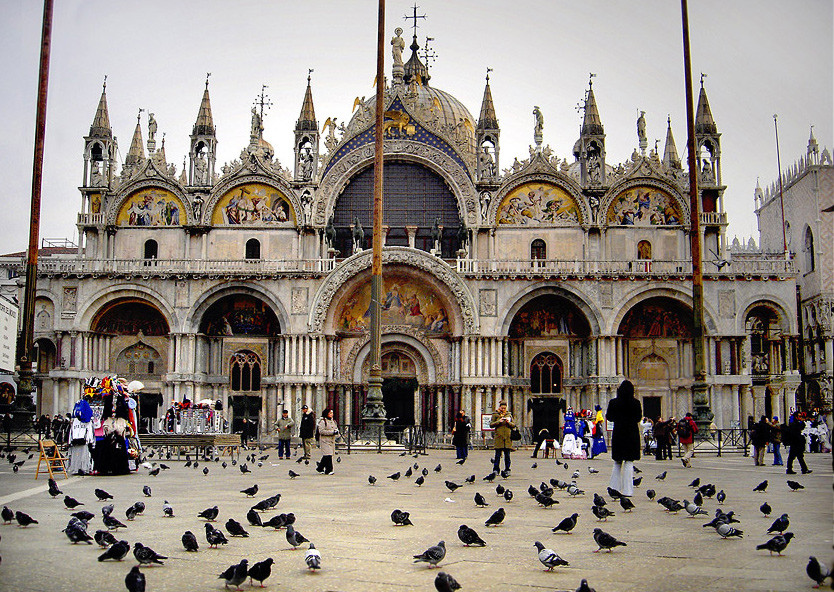公元828发生了一件威尼斯历史上具有重大意义的事情。基督教圣经新约最重要的部分是《四福音书》,分别由耶稣基督的弟子即十二使徒中的约翰和马太,以及基督的再传弟子马可和路加撰写。传说当初就是圣马可来到最早的威尼斯地方,让当地人皈依了基督教,所以威尼斯奉圣马可为本城的主保圣人。圣马可本身住在埃及的亚历山大,死后遗骨埋在亚历山大。828年,两名威尼斯商人把圣马可的骸骨从亚历山大城偷运回威尼斯。在中世纪的欧洲,人们都很迷信,拥有圣者的骸骨对任何城市都是一件至关重要的事情,既提高了城市的地位,又能带来很多朝圣者,这些朝圣者跟今天的游客一样,他们的消费会刺激本地的经济发展。威尼斯得到主保圣人圣马可的遗骨喜出望外,为了容纳宝物,接待源源而来的朝圣者,威尼斯就开始建造一座宏伟的大教堂,这就是今天在城市中心点,圣马可广场上的圣马可大教堂。