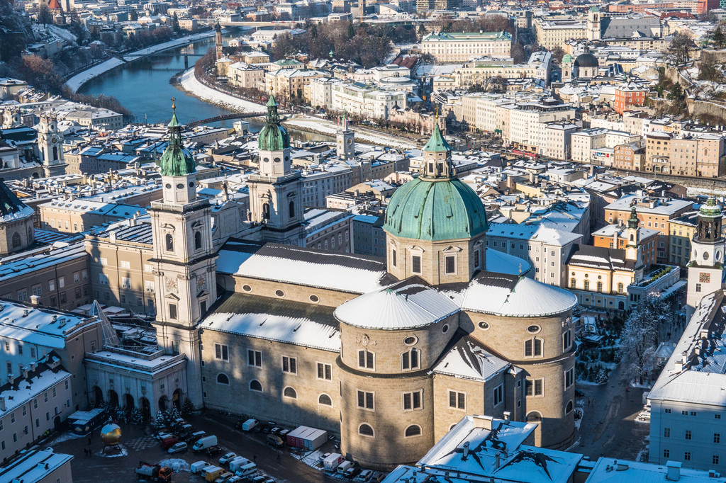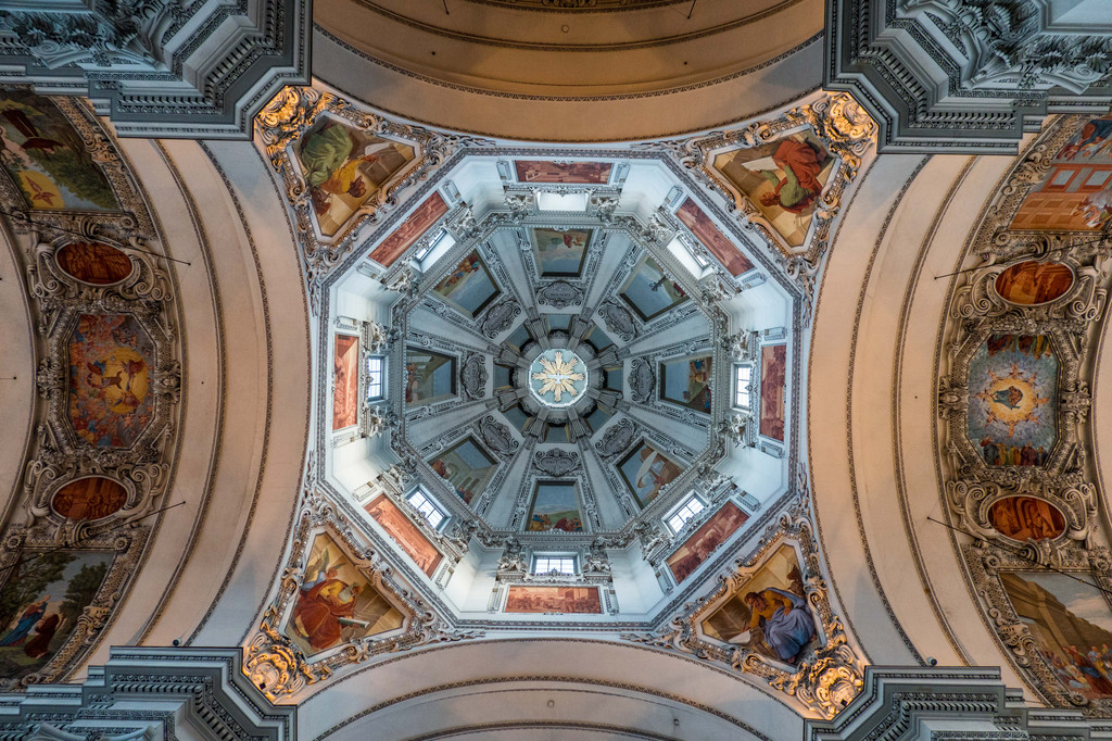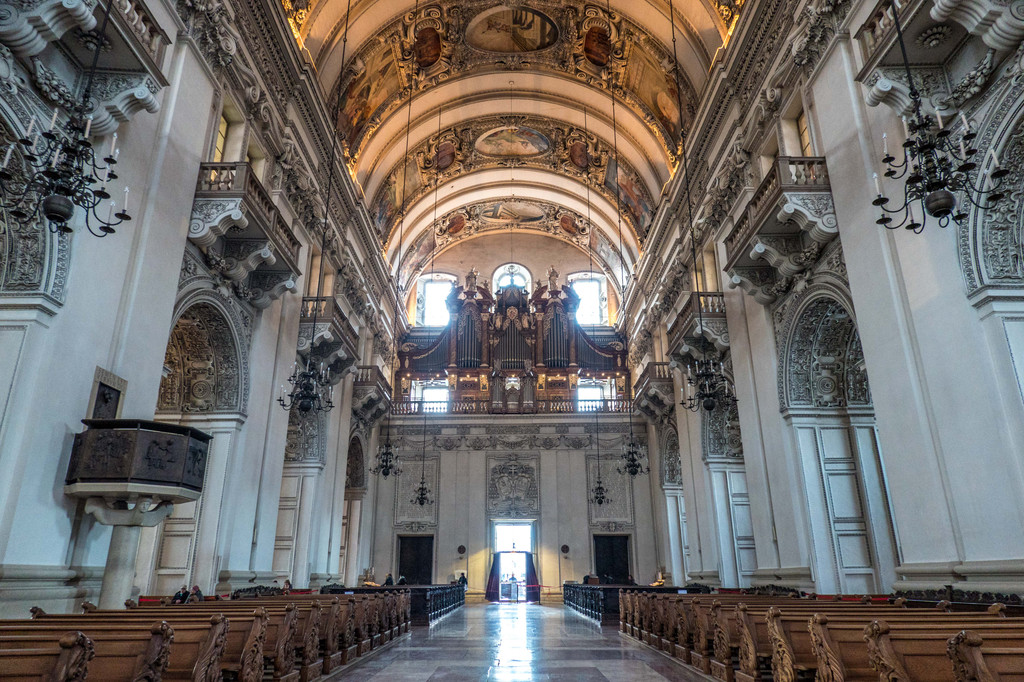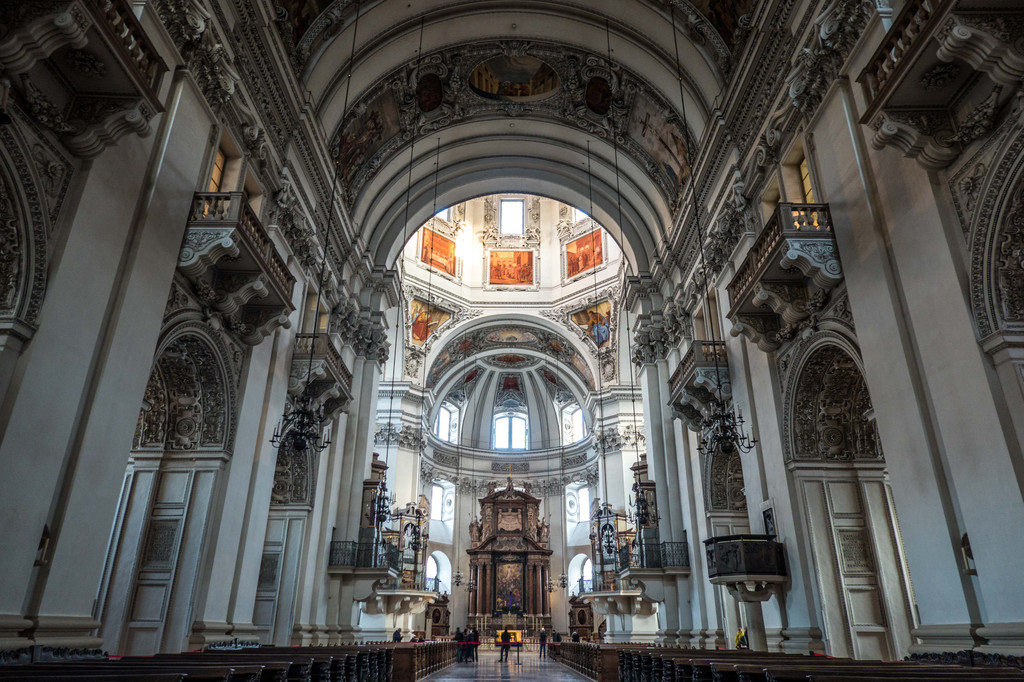 沿着粮食胡同一路向前,就能走到萨尔茨堡大教堂(Salzburger Dom),教堂坐落在老城区的中心,其恢弘的外观和巨大的圆顶,都让它成为了阿尔卑斯山北部地区早期巴洛克建筑风格的典范。