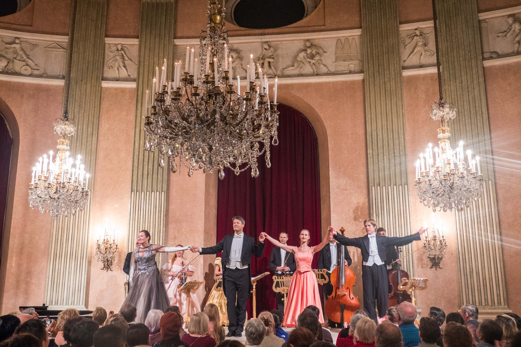 在那些极具年代感的音乐厅中,水晶吊灯低低垂下闪烁的光影,那些或红或蓝的背墙上,镶嵌着巴洛克式的华丽装饰。