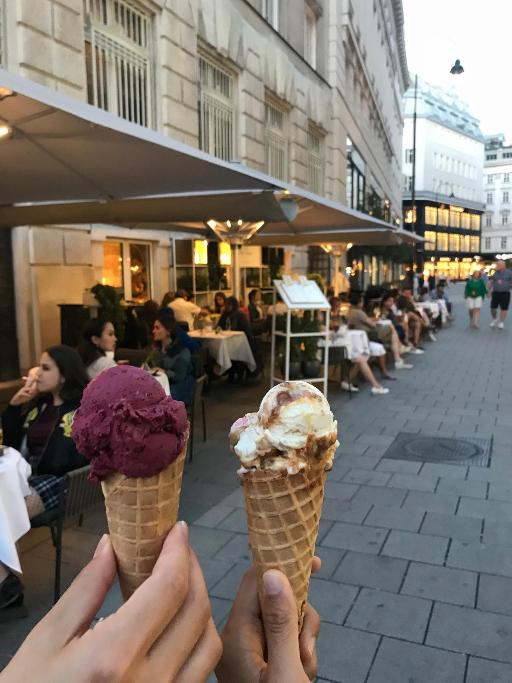 首先是 第一区中心 的 维也纳金三角时尚区,那里的Cafe Am Hof有很好吃的甜点,我最喜欢就是他们家的巨马卡龙和夏天限定的冰淇淋,尤其是焦糖口味,冰淇淋里有点点薄脆饼乾,是我在维也纳吃过最好味的冰淇淋!!