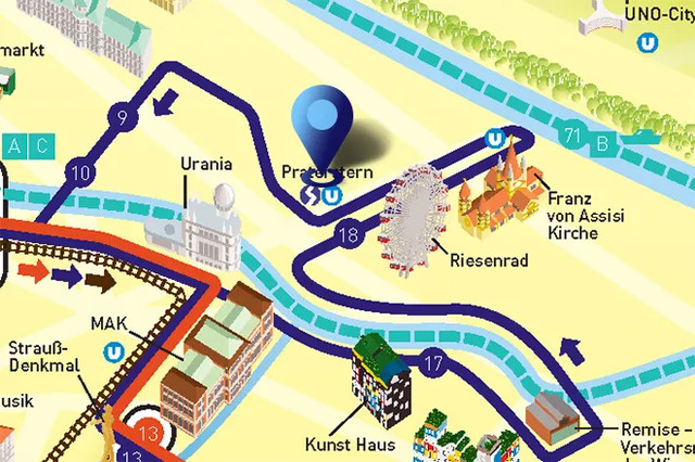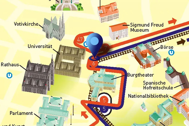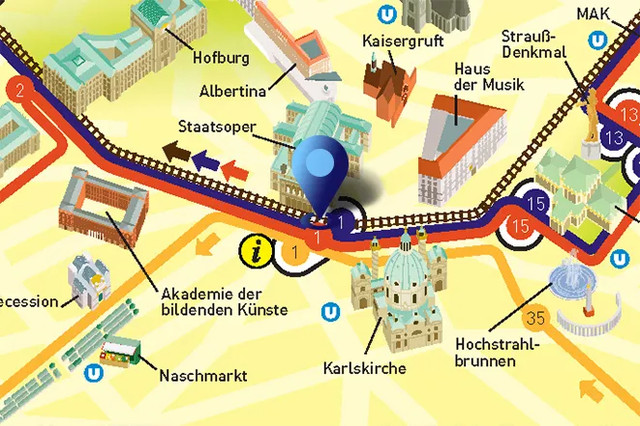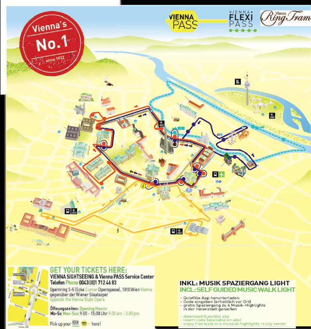 不可思议的维也纳音乐篇章即将开启, 5 条精选路线(红、蓝、绿、灰、黄)不限次数随上随下,你还将免费获得“自助式音乐漫步”灯光的音频文件。在音乐巨人周围会发现怎样的乐趣?系好安全带,我们出发!