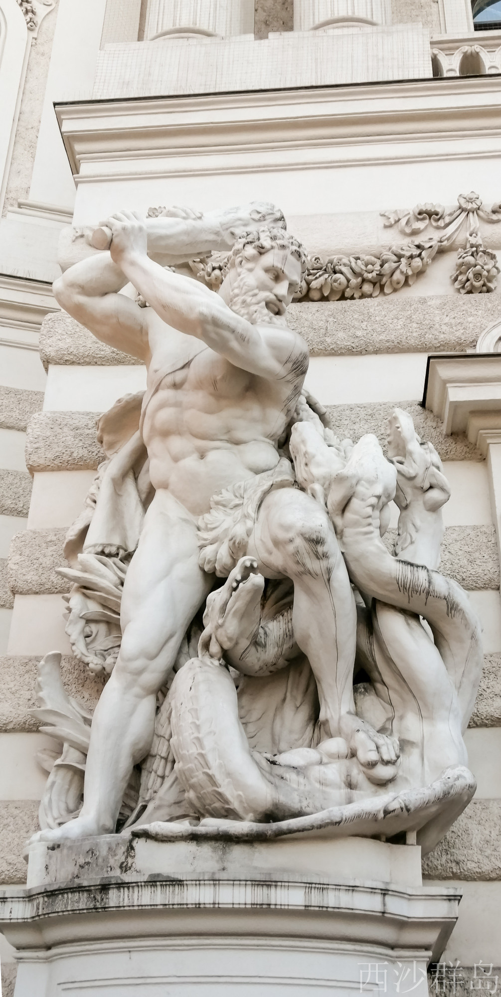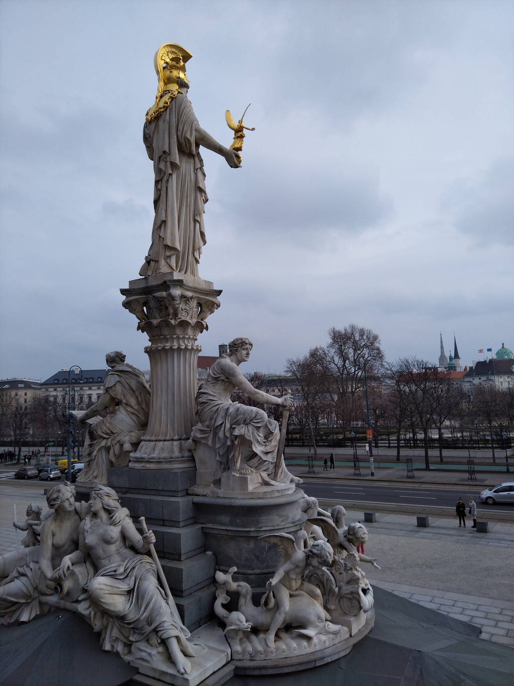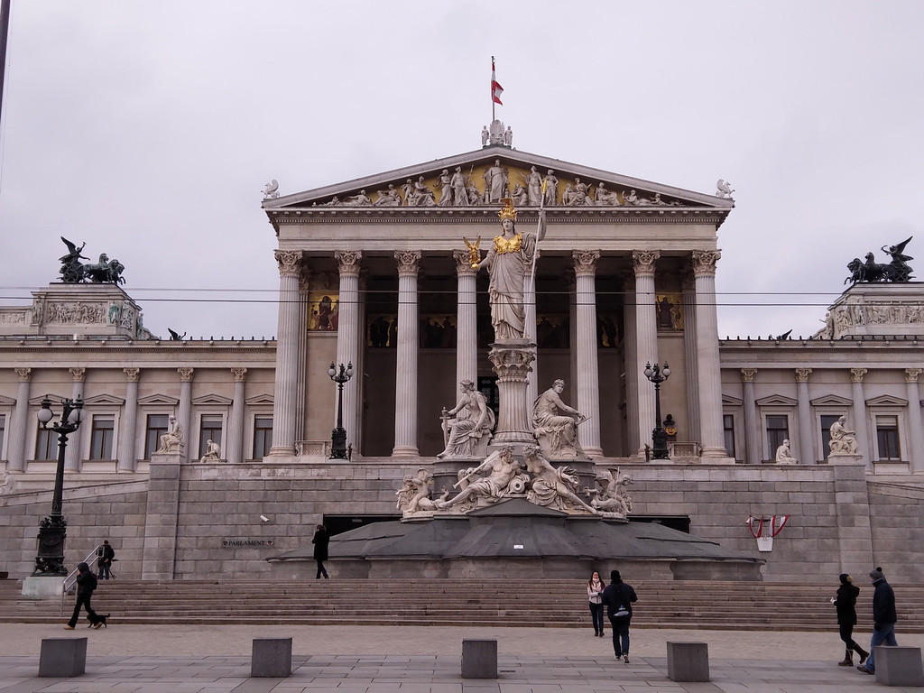 穿过环形大道,对面就是卡尔广场上查理教堂,教堂的门廊是古希腊神庙的风格,漂亮的科林斯柱式,支撑起三角形的山墙。栩栩如生的人物雕像,以及两根刻有浅浮雕的圆柱,都精美之极。