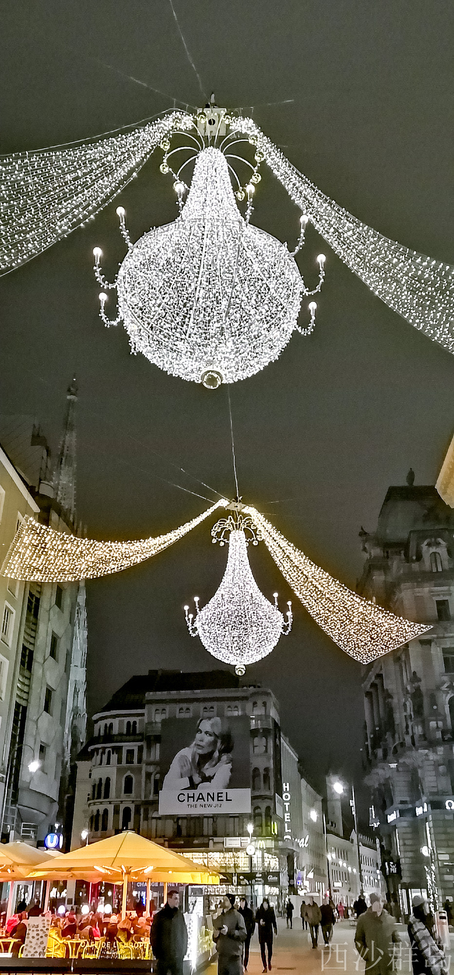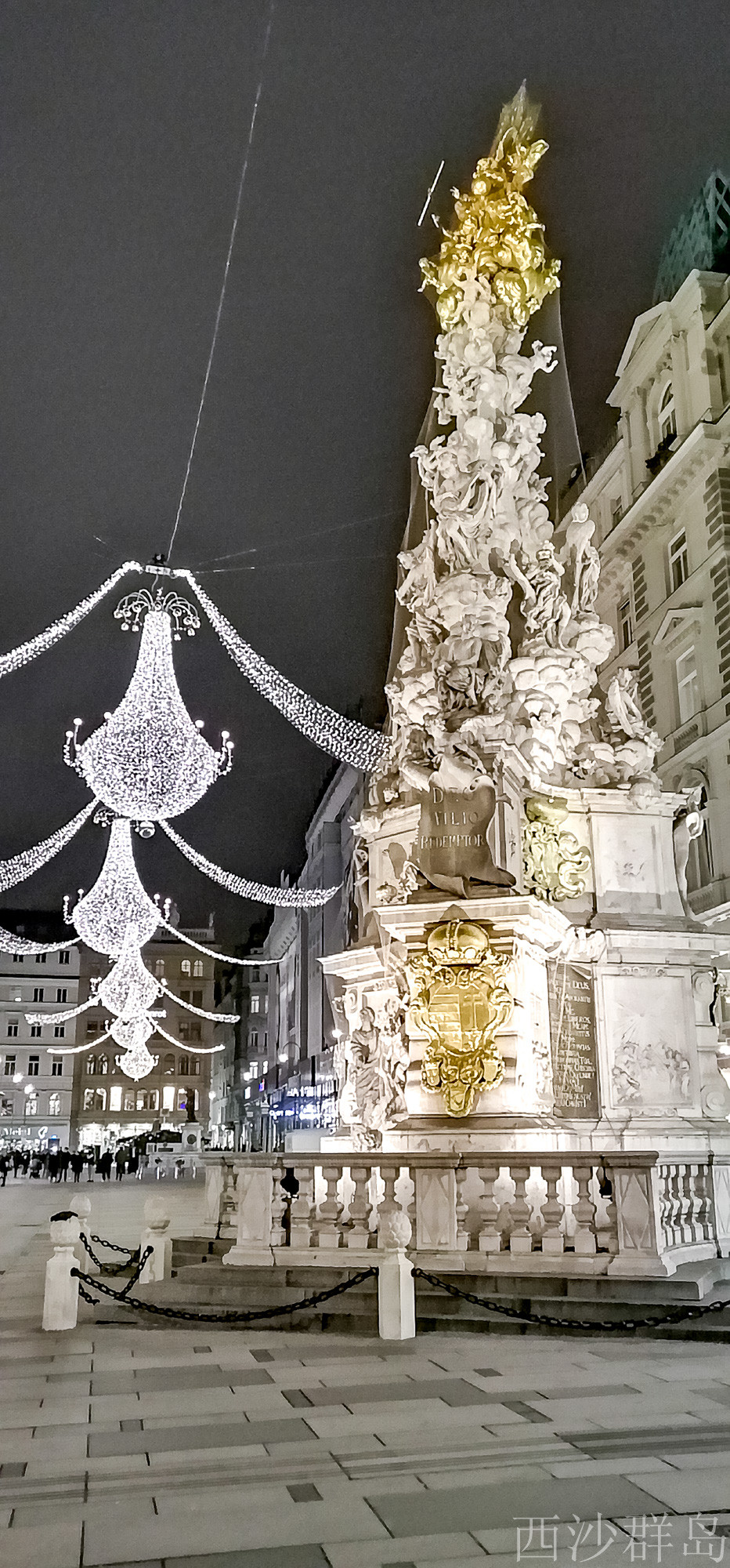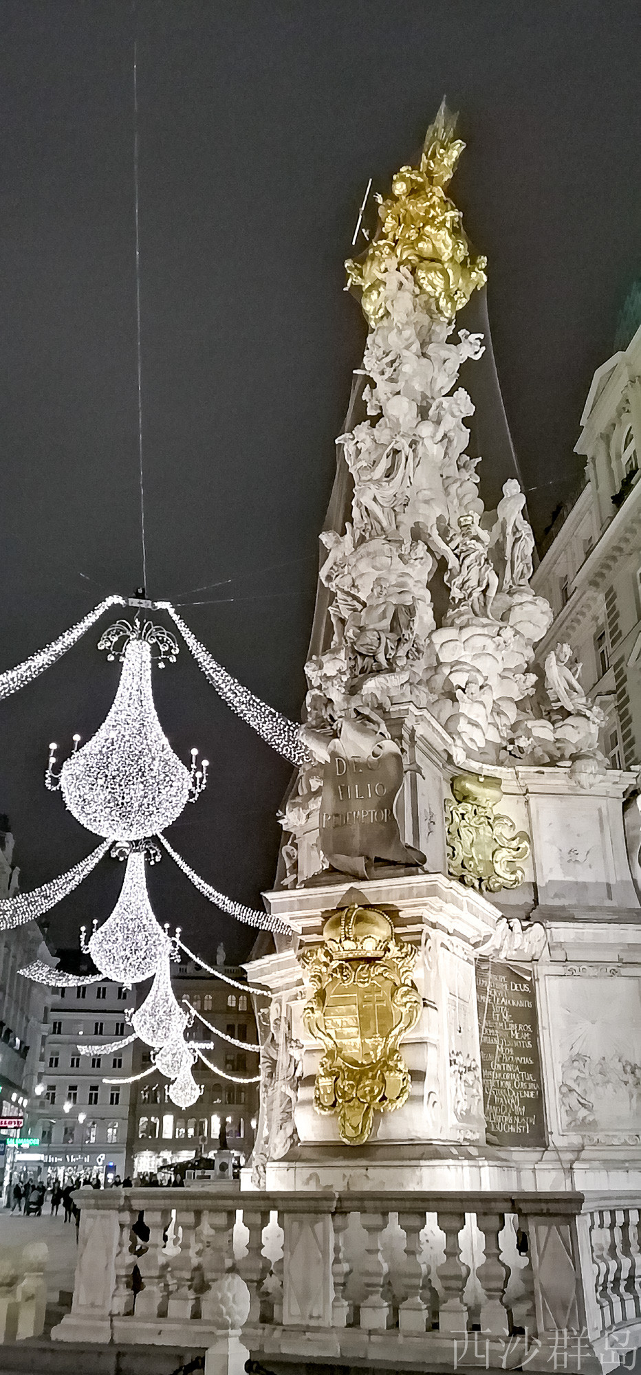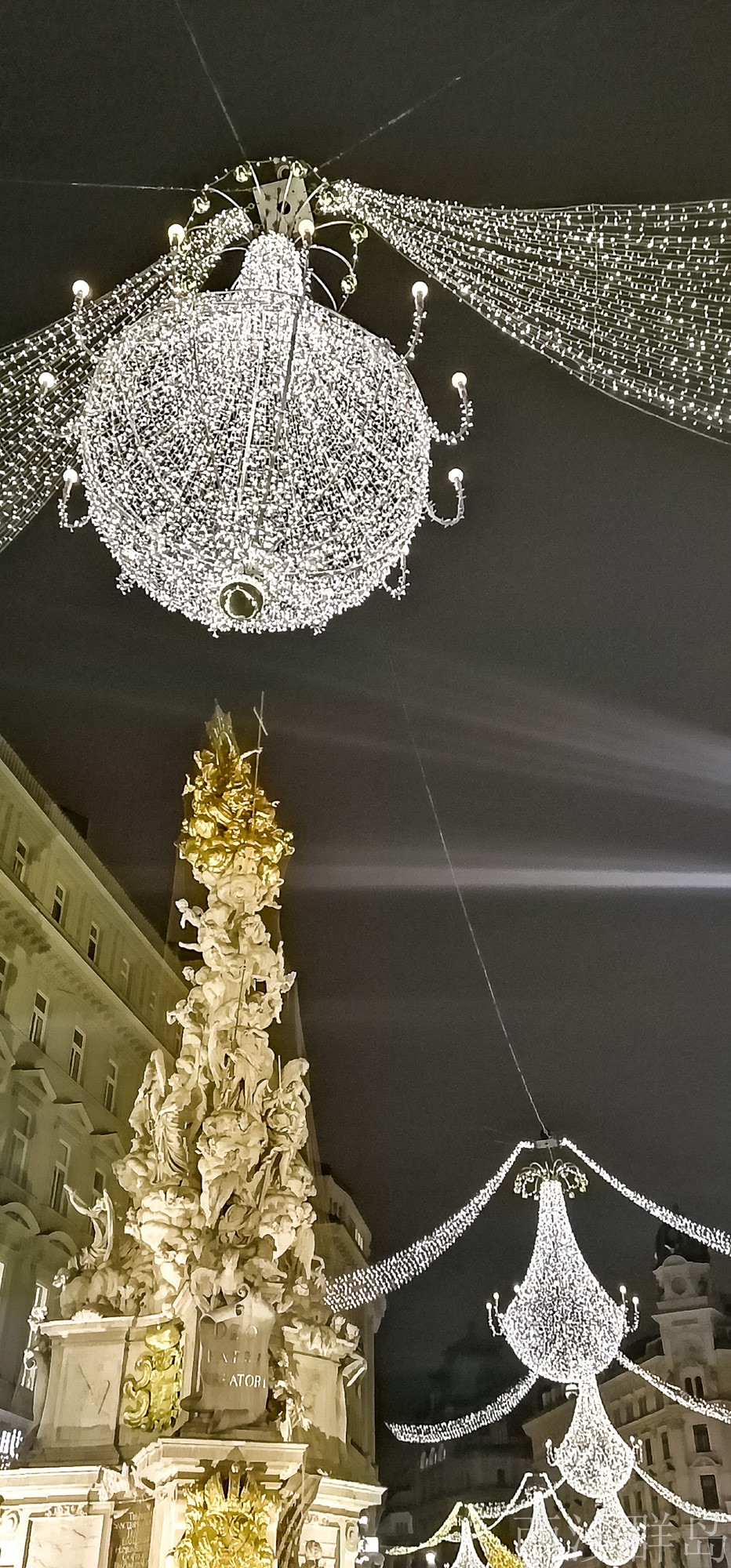 灯光闪烁圣诞气氛也超浓郁的格拉本大街中央矗立欧洲最大的巴洛克式的“黑死病纪念柱”。