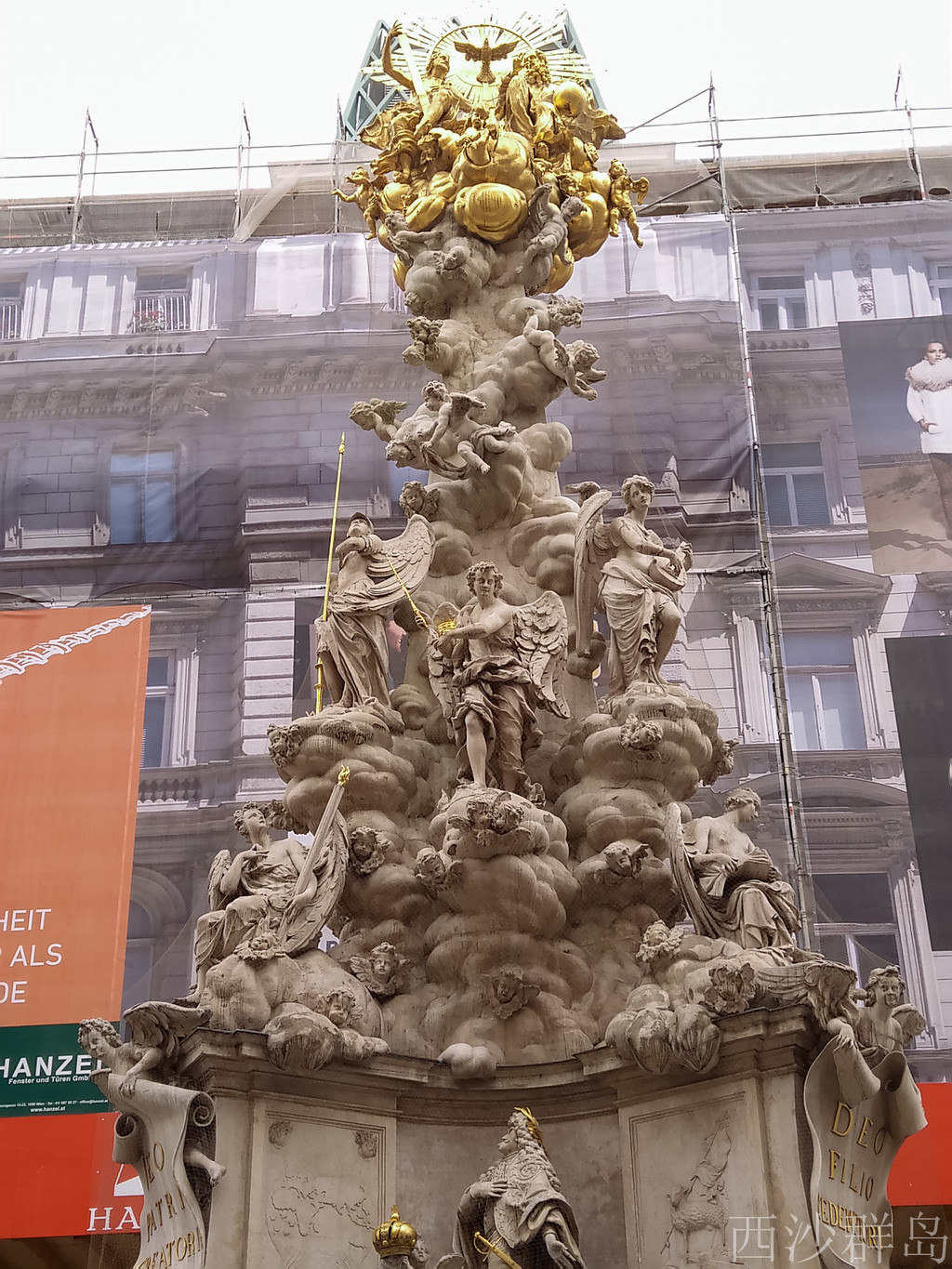 这根纪念柱的外型台座上描绘着神创天地、黑死病流行、最后的晚餐等浮雕。柱身表现了皇帝摘下皇冠,半跪在地上祈求上帝保佑自己的臣民以及在天使的指引下,圣人打倒化身女巫的黑死病。