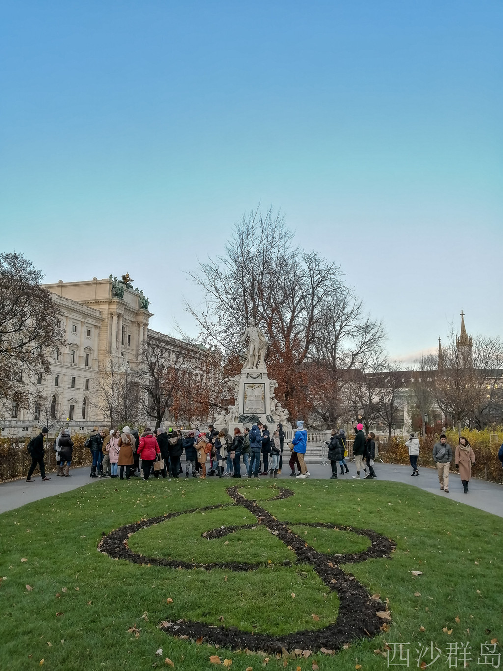 漫步环形大道,城堡花园有才华横溢的天才音乐家莫扎特雕像,雕像前的大草坪,红色鲜花组成乐谱高音符号。