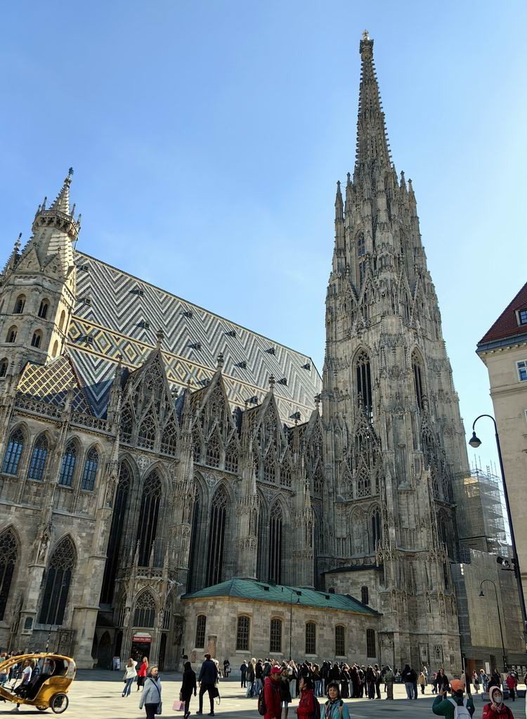 圣斯特凡大教堂建于12世纪末,高高的塔尖高达137米,仅次于德国科隆大教堂。图为我在圣斯特凡大教堂前拍的纪念照。