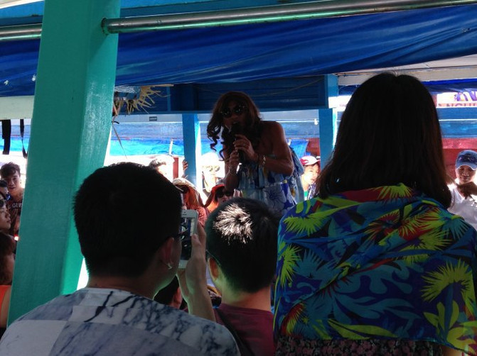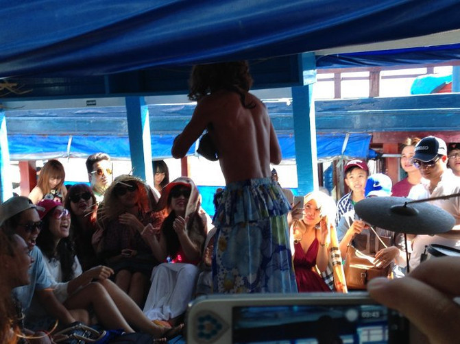 然后船继续开往第三个岛,你可以留在船上,上岛喝点东西,坐坐看看。我前三个岛都没有上去,感觉不值。但到了第四个岛,所有人都必须下船上岛,一个小时后船再回来接你。我注意到这些船只是在附近休息,上岛要付1.5美金,岛上可以吃点,喝点,上上厕所。你也可以站在码头上等一个小时,那就上岛休息吧。