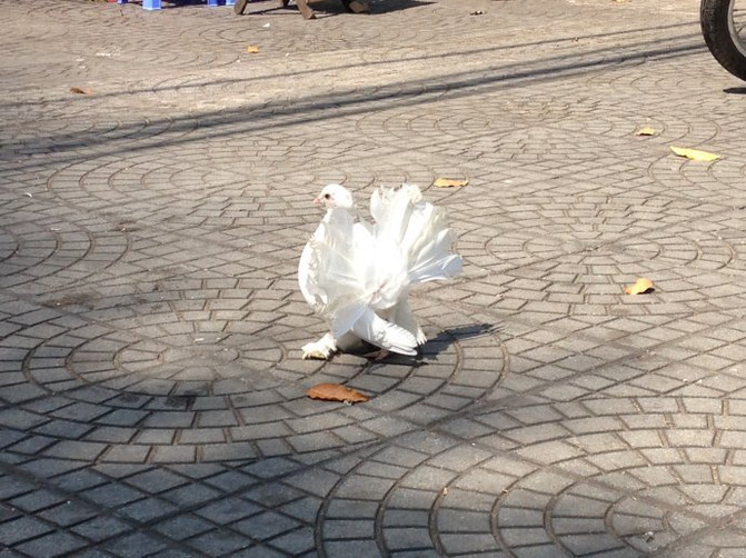 教堂旁边的街道上一只鸽子打开尾巴,是想学孔雀开屏还是。。。。。。?