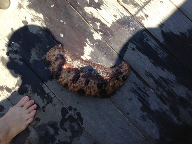 这里还是养殖海参的地方,看看,这么大的海参足足有3-4斤那么重啊!就在潜泳的海底捞上来的,随后又被放回了水里。