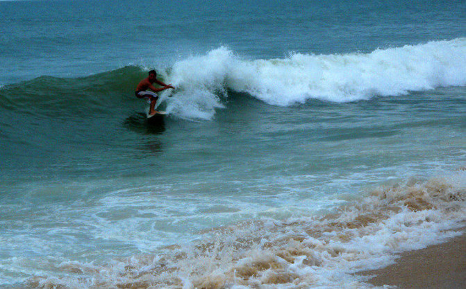 一大早就有不少弄潮儿来到海滩, 海滩另一边就是大道
