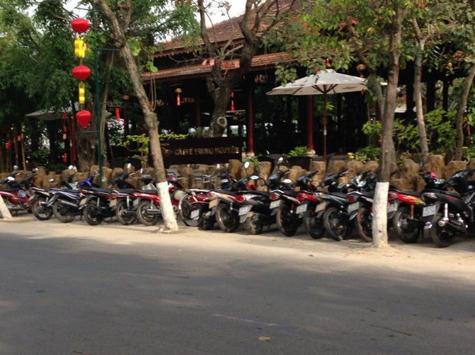 从岘港到河内差不多有900公里, 巴士在一家旅馆前停下接游客, 这一整排的摩托车都是供租用的.