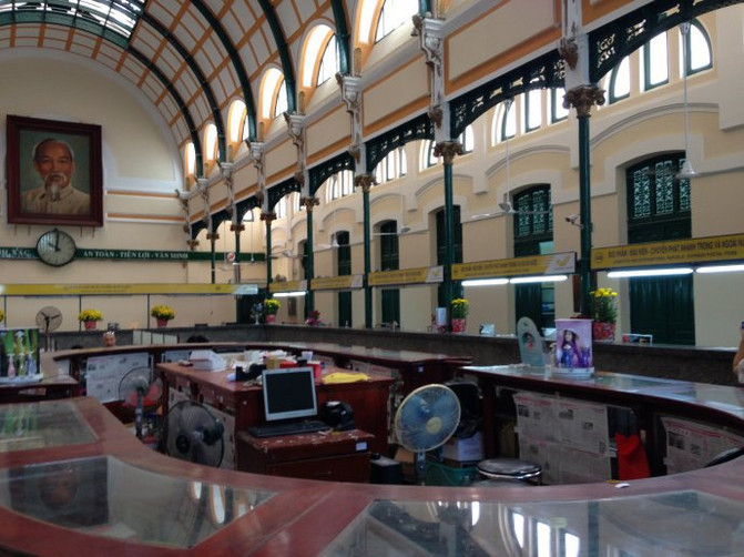 此邮政局和西贡王公圣母教堂相邻胡志明市中心邮局既是一个著名景点,又保留着邮局的职能。这个几乎每一个游客都会到访的法式建筑,由法国于1886年至1891年兴建,1892年正式启用,是法国殖民时期的第一座邮局。