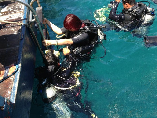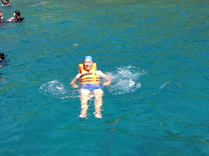 潜泳太贵了,我还是自娱自乐吧。 换衣服只能在狭窄简陋的船上厕所里解决。