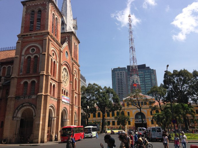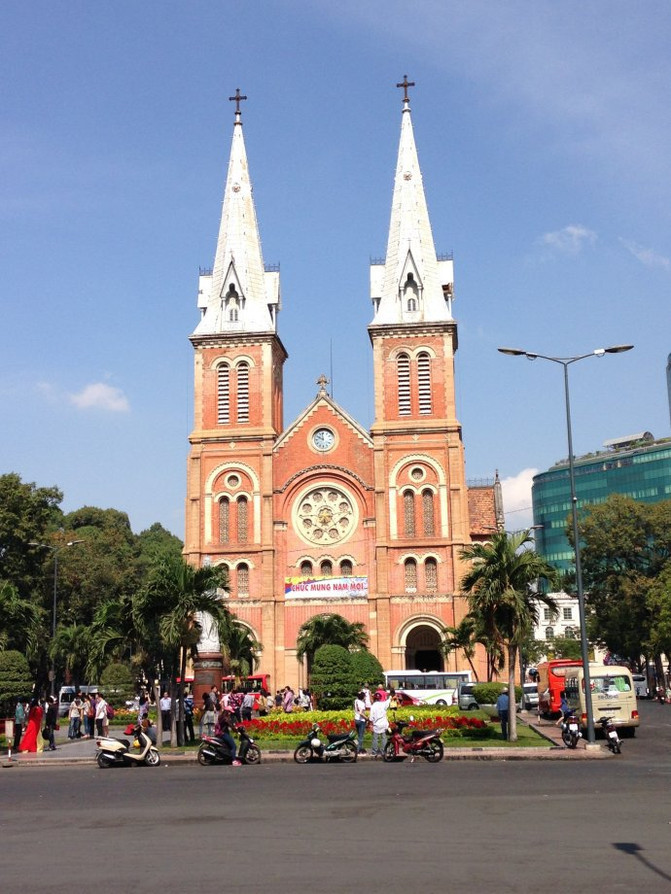这个位于整个胡志明市最中心的教堂建于1877年至1883年间,是天主教胡志明市总教区的主教堂,典型的哥特式建筑,是胡志明市标志性建筑之一。教堂的两座40米的钟楼仿照巴黎圣母院的设计,所有的原材料皆来源法国,外墙的砖来自马赛,因此历经一百多年之久,红砖丝毫没有褪色,所以这个圣母教堂还被称作“红教堂”。教堂前伫立着圣母玛利亚的雕像是1945年罗马教会相赠的礼物。很美的一座教堂,是仿照巴黎圣母院制造的,最特别的地方就是,一钻一瓦都是从法国运送过来的,所以特别有法国气息。