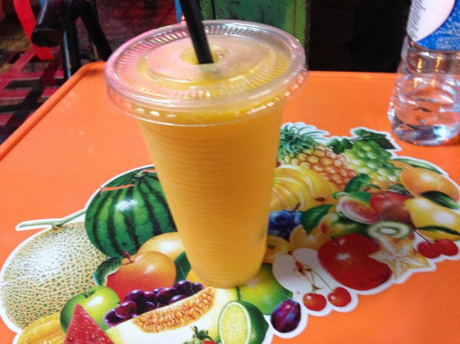 我的最爱,水果冰沙,这在老挝和柬埔寨很多,这里很少。这家水果冰沙的小摊子位于Bui Vien街,在范五老街区挺有名的,在一个小巷子的巷口,从外表看跟其他的水果冰沙没有多大区别,但是一到傍晚,成群的游客结伴来到这里喝冰沙,就连当地人也经常光顾这里买了带走。一杯2种以上水果的shake在18,000越南盾起,因水果不同,价格也会不同。