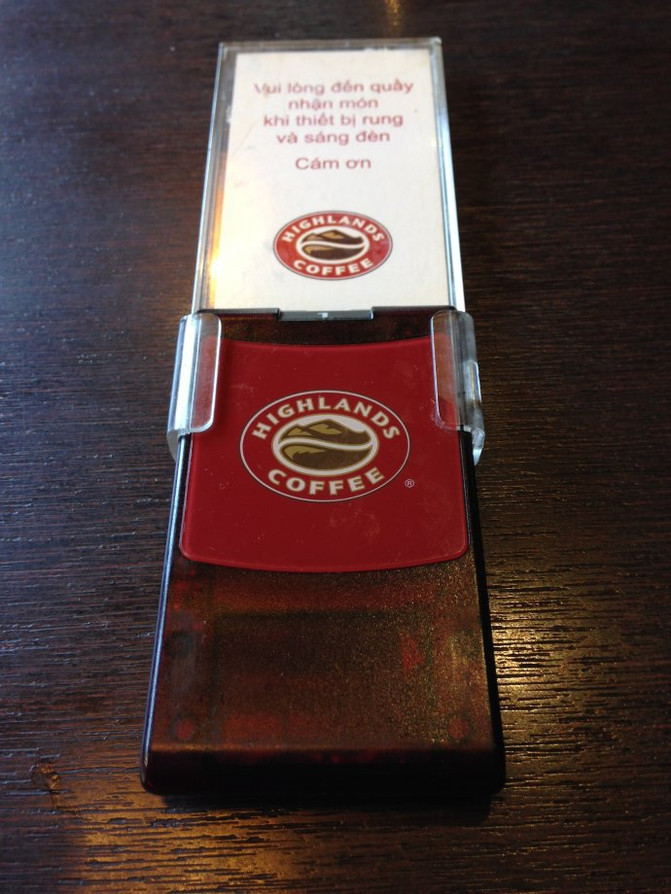知道这派什么用吗?付完钱你拿到它,当你的咖啡准备好了,它会震动或发声,你去柜台拿咖啡就是了。