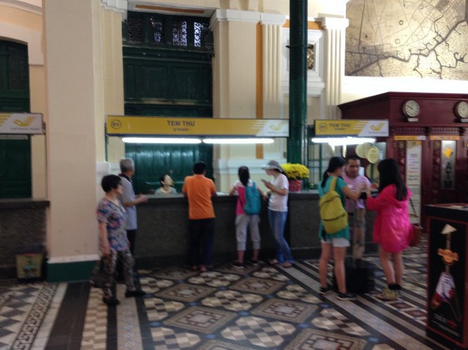 Tips:邮寄注意事项邮局内提供免费明信片的篮子通常只是个摆设。邮局内卖的明信片可选性不多,质量也层次不齐,如果不是赶时间,可以在其他地方(如范五老街)挑选,邮局内设有桌椅,可以坐着填写。邮寄到中国的邮资是10,500越南盾,但由于500面值的越南盾较少,很有可能支付11,000越南盾后没有找零。