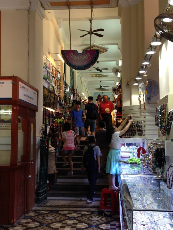 空旷的大厅富丽堂皇,显眼处悬挂着胡志明的大型肖像,两旁的墙壁上则是越南的旧地图,旧地图下设有特色电话亭可以拨打国际长途,大厅两侧设有纪念品店和提款机,以及信息中心和货币兑换。再往里走,才是真正意义上的邮政服务,到这儿的每一个游客都会给亲朋好友或是自己邮寄一张明信片作为纪念。此外,如果想在邮局内的长椅上拍复古风格的照片,建议早一点来,抓拍要快!
