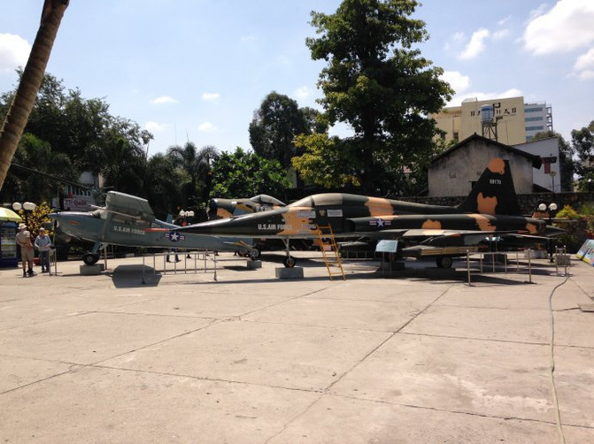 门前停放着当年美军的军备,包括战机、直升机、坦克和火炮