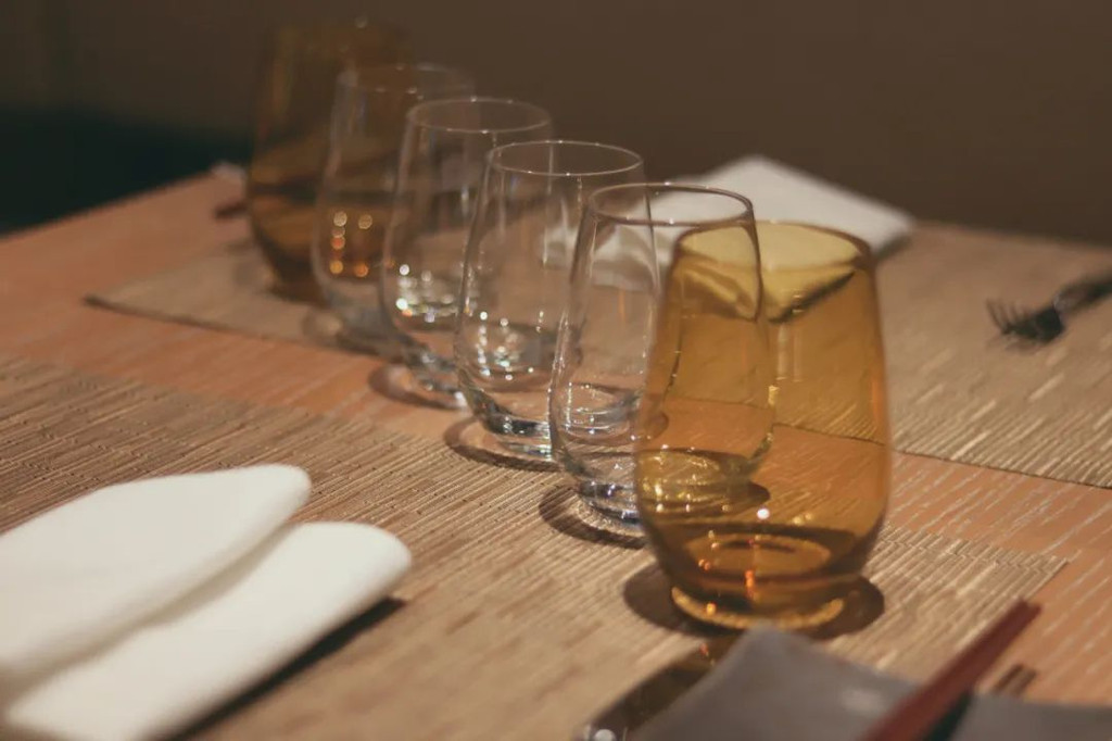 最值得称道的是,从进门每张桌上阵仗惊人的杯子就可以看出,这里会有侍酒师根据当天菜式不同,精心挑选佐餐配酒。一顿饭可以尝试3种不同的美酒,将食物里面的鲜香最大限度调动出来!