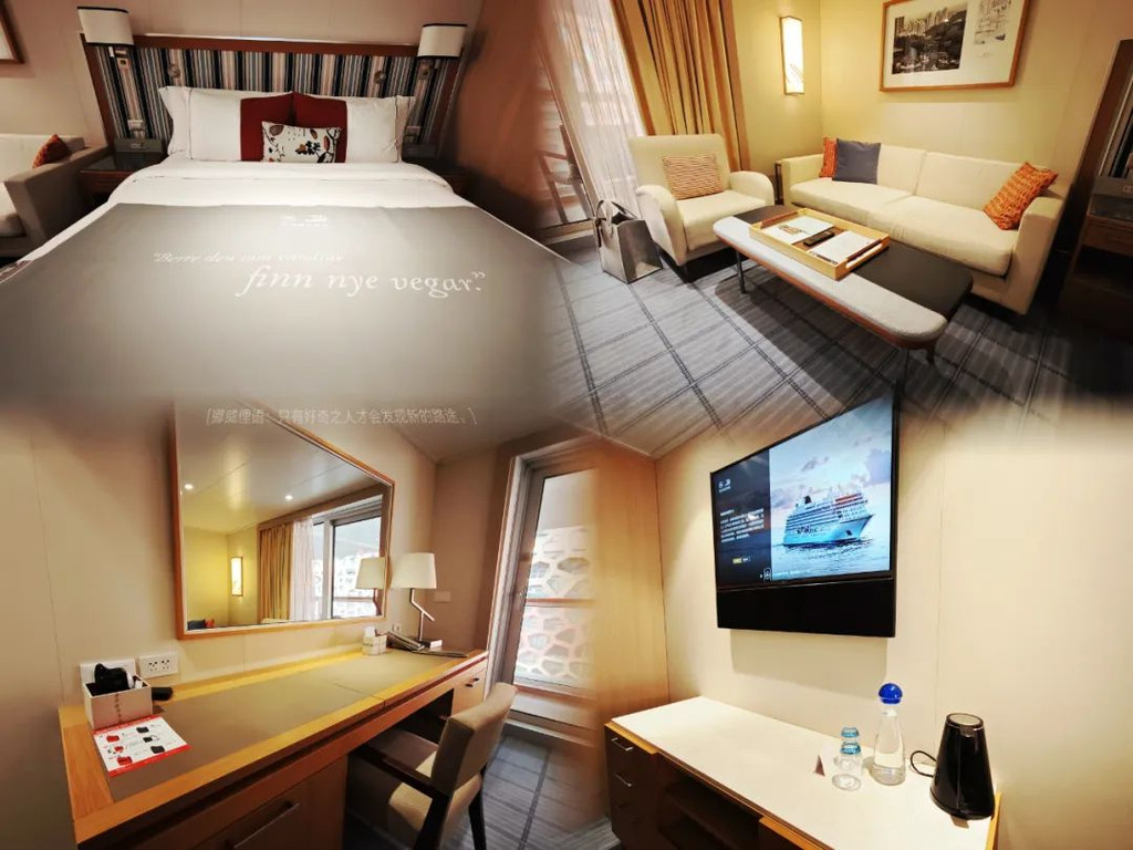招商伊敦号共有6种房型,皆为阳台房,面积从25平方米到134.5平方米不等。作为面积极为有限的海上移动城堡来说,这个面积给得相当奢侈了(此时此刻严厉的眼神给到香港的酒店们)。