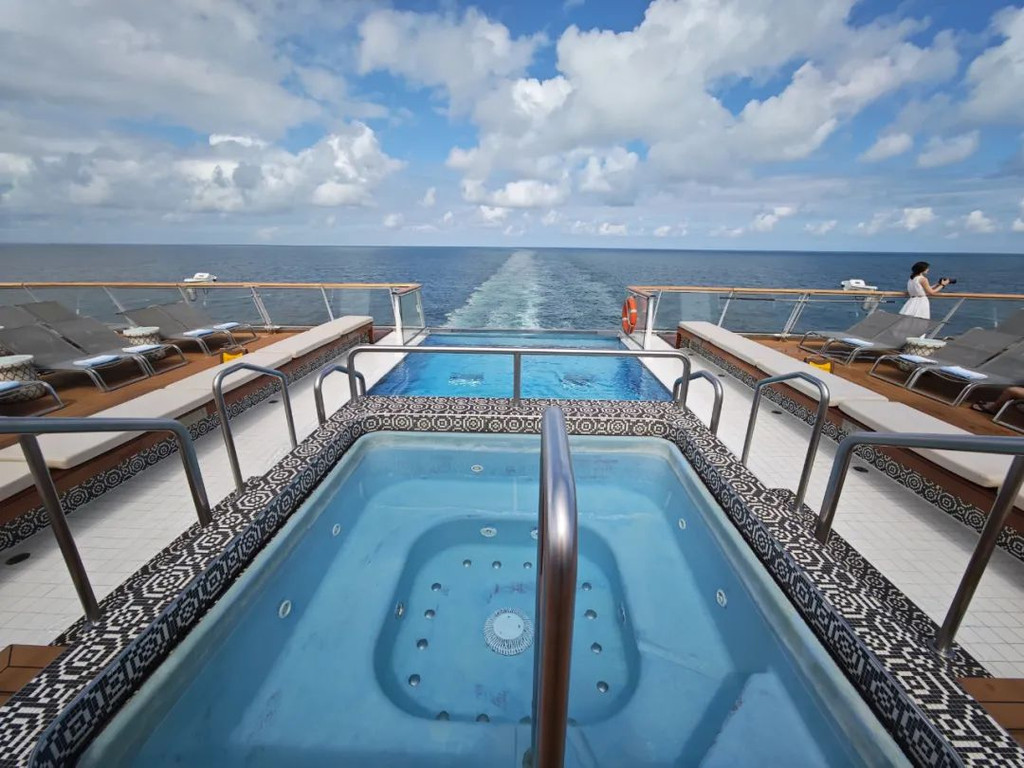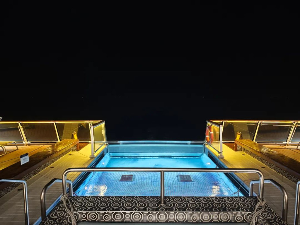 船头的无边泳池夜晚显得尤为浪漫,让您在星空下尽情畅游,感受大海的宁静,白天面对碧海蓝天,又格外上镜。