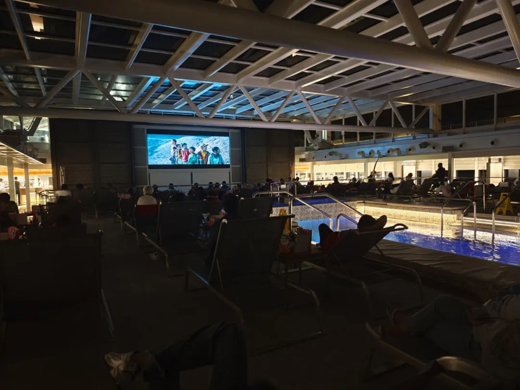 中央泳池设有恒温,旁边设有座椅,成为星空电影院,让您在泳池旁欣赏热映大片,座无虚席。千万要提前占位,我就是踩着点去,错失《八角笼中》,可谓遗憾!