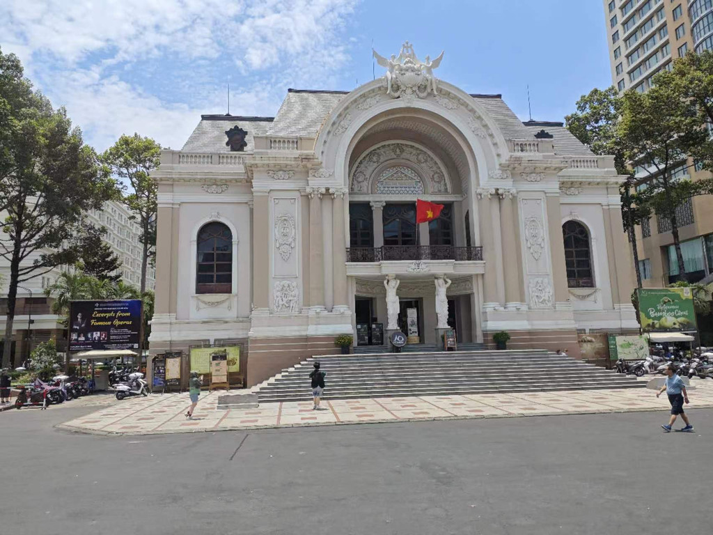 胡志明市立歌剧院,也称西贡剧院,是一座欧洲风格的哥特式建筑。歌剧院外墙有各式各样的浮雕和花纹,都是按照当时法国同类歌剧院建造而成的,显得十分精美。