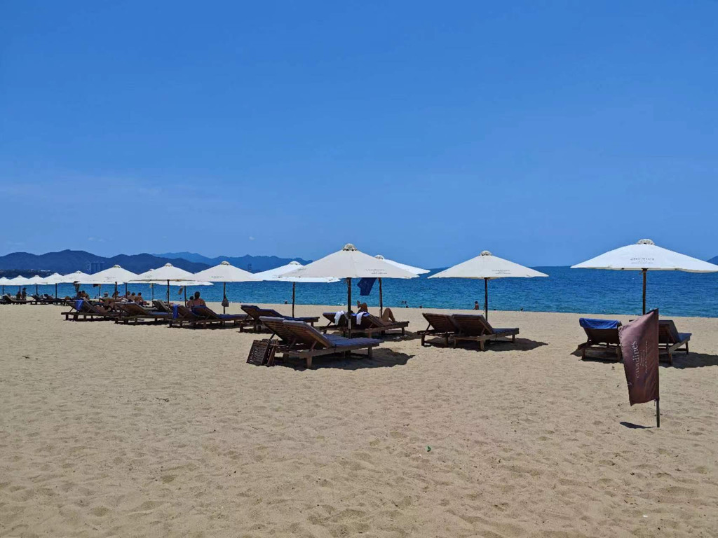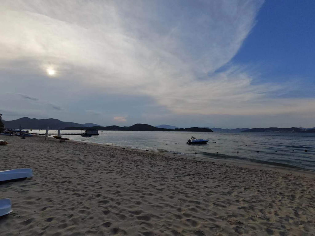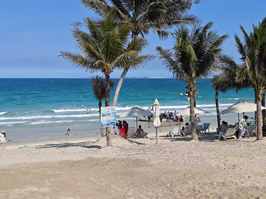 芽庄海滩,长7公里多,形状酷似一弯新月,拥抱着碧海,沙白滩软,水清潮平,是一个不可多得的天然海滨浴场。