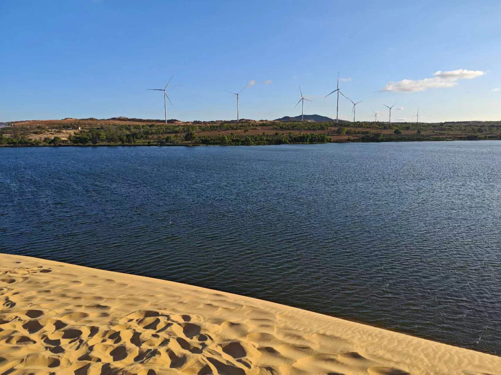白沙丘从局部看完全与沙漠没区别,从高处望去,可以看到线条分明的几个起起伏伏的沙坡,沙坡的下面是个湖泊,俨然一个缩小版的沙漠与海洋。