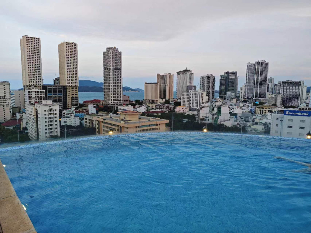 市区酒店的屋顶游泳池,即可以看见芽庄市中心建筑,也可以远眺大海。