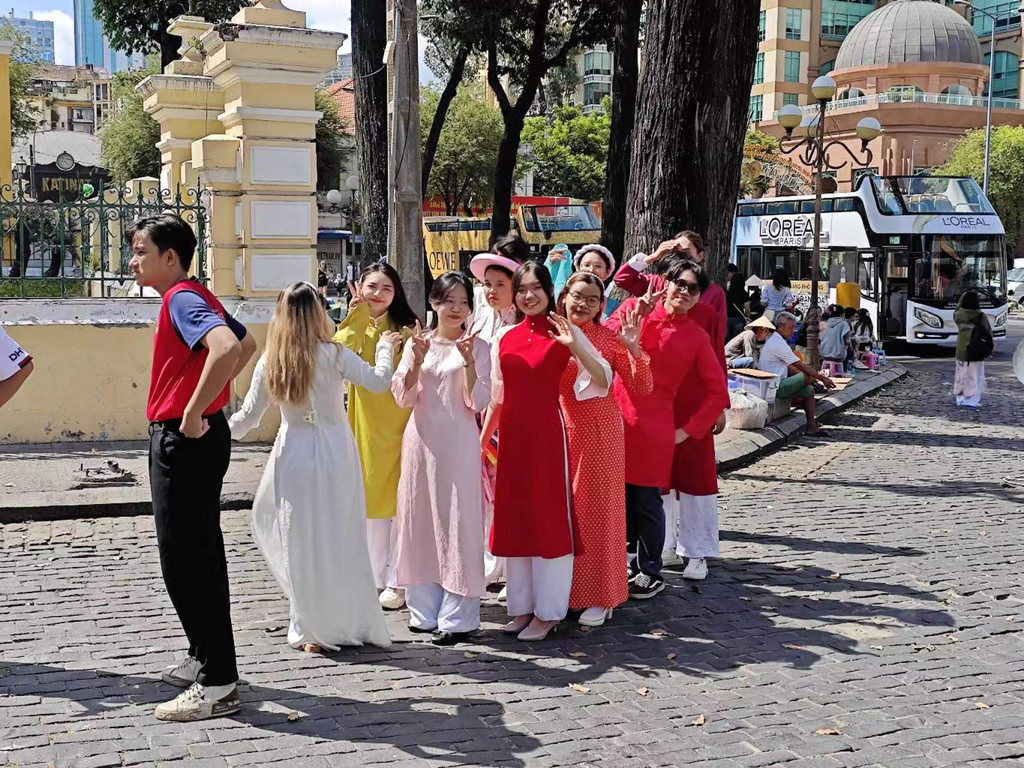 广场前身着越南民族服装的姑娘们摆出友好的poss
