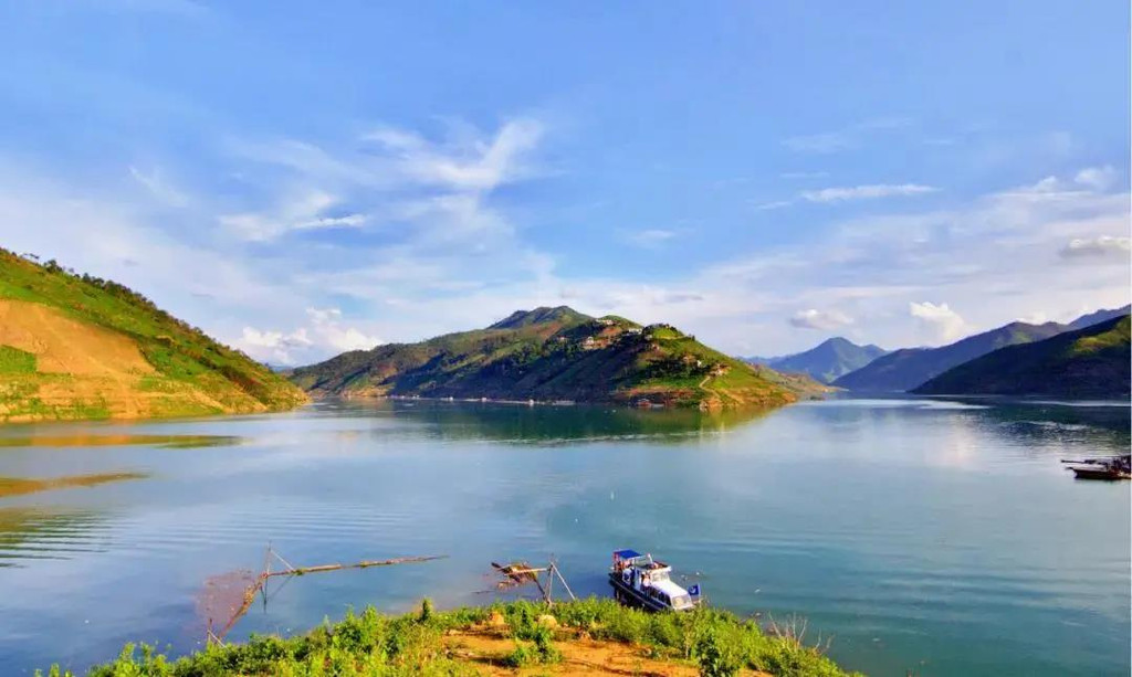 碧蓝的北盘江像一条蓝色的纽带缠绕在大峡谷的怀抱里,鸥鸟飞逐,波平如镜。空气也显得清新异常,沿河两岸,绿树葱葱,芭蕉林密,各种小鸟,歌唱戏逐,好不快活。