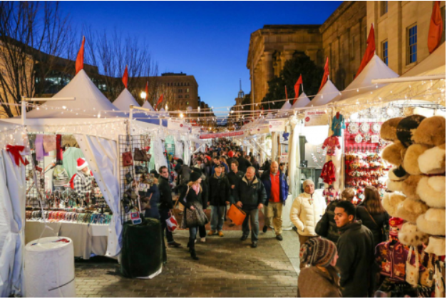 这个免费的市中心集市今年扩大了其空间,以扩大社交距离。位于史密森尼美国艺术博物馆和国家肖像画廊的中心,受人喜爱的市场横跨第7街和第9街之间的F街的两个街区。您可以从几十个快闪帐篷里挑选五花八门的商品,同时欣赏着季节性风味的现场音乐演奏作为背景。当地的烤咖啡和眼前制作的迷你甜甜圈可以激发寒冷天气的食欲,创造一种你在华盛顿其他地方找不到的节日氛围。在第8街和F街将会有一个入口。集市于11月19日至12月23日开放(11月25日、12月6日停业),营业时间为中午12点至晚8点。
