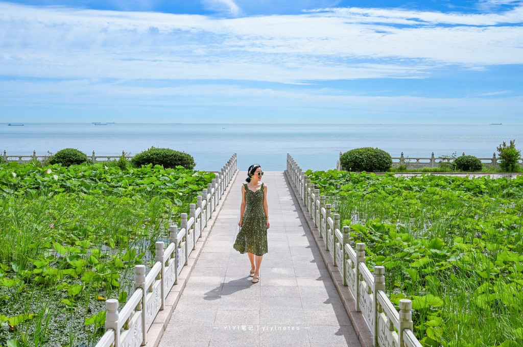 长廊的两旁种满了荷花,与前面的海水、蓝天相互连接,非常漂亮。