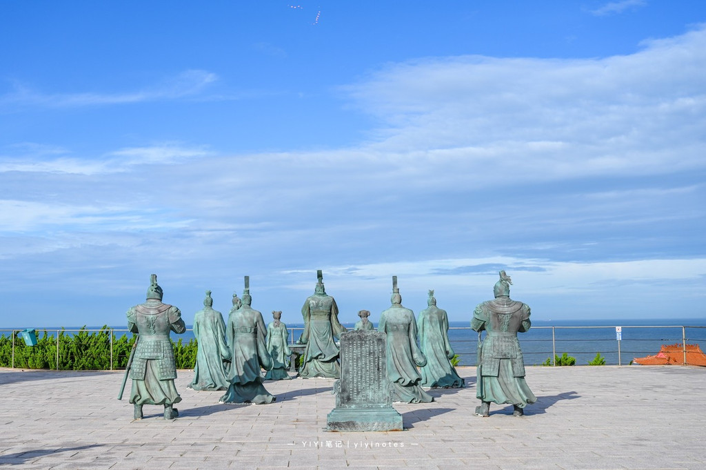 景区正东方向的海上礁石处,还铸造有一个日神铜像,也就是太阳神。旁边就是秦始皇的雕像正在拜日神,希望求取长生不老之药。