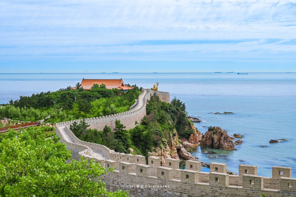 在这儿还建有长城,气派十足,几座大殿更是一直延伸到了海边。