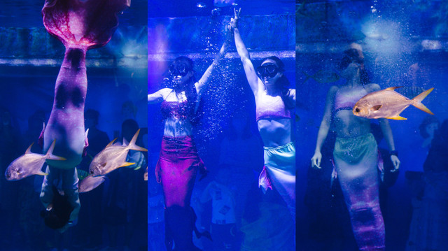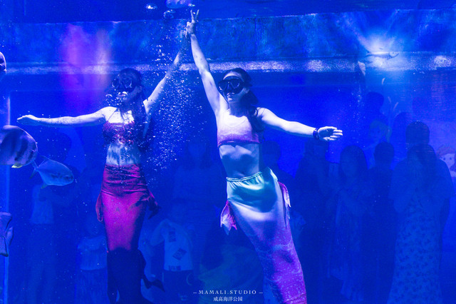 与鱼共舞的美人鱼身姿曼妙灵动,做着各种高难度动作,精彩的表演引得观众场场爆满,座无虚席。
