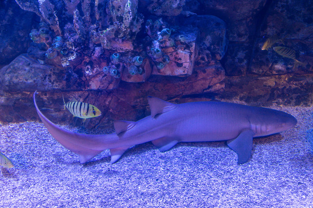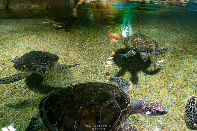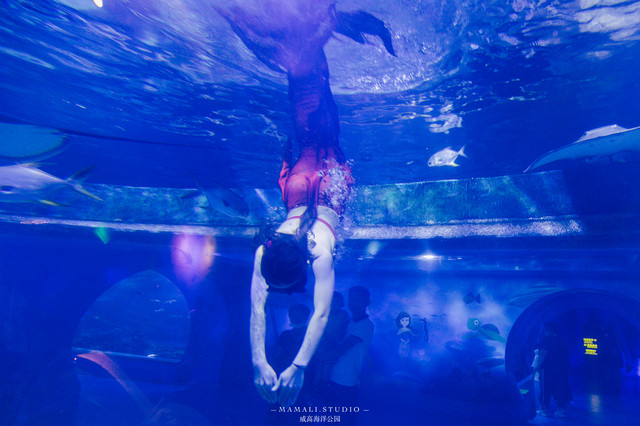 走入蜿蜒曲折的海底通道,感觉如同走在幽蓝海洋的海中央。神气的鲨鱼威风凛凛、遮天蔽日的鳐鱼从头顶飞旋而过、慵懒的大海龟趴在满是珊瑚礁上打盹,色彩斑斓的热带鱼,大大小小的鱼群竞相变换队形,展示着优美奇丽的海底梦幻世界。 站在海底通道可以看到鲜艳的、斑谰的鱼类舞动在眼前,而这里最值得等待的就是一场美人鱼表演。