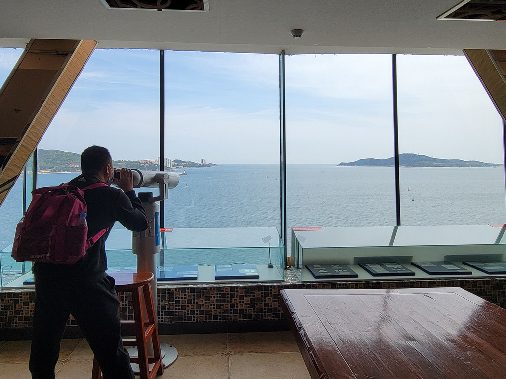 在这里可以使用世界先进的360度旋转高倍望远镜。视野宽阔,东方尽收眼底的是刘公岛,岛上拥有秀美的自然风光和有甲午战争时期、英租时期的建筑和历史印迹。向西可以看整个威海市中心风貌。