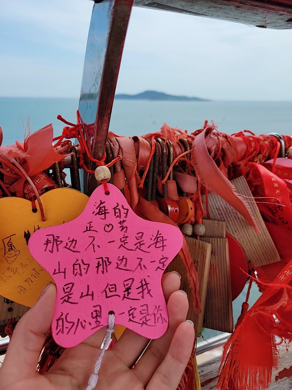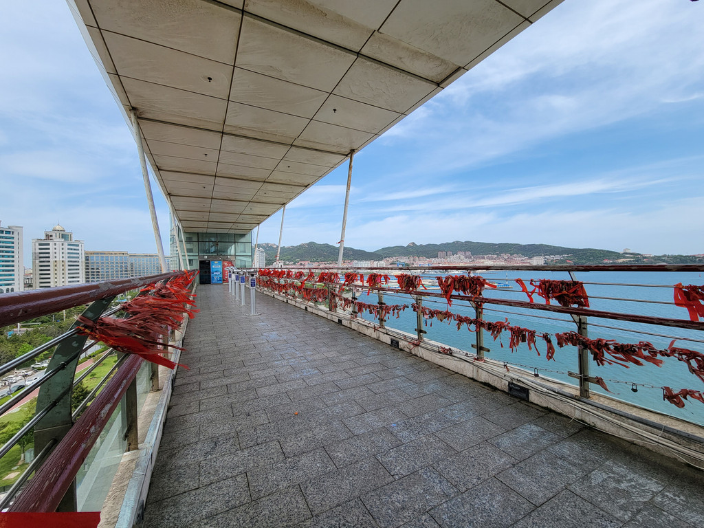 下到幸福门11层的横向观光长廊,像今天的天气,站在长廊中,风力尚可,平台栏杆上游人系的福袋,挂的同心锁会发出“叮叮铛铛”的悦耳声响,空气中跳跃着祈福的韵律~此情此景竟然能感知到他人那份真诚、真挚的情感寄托,心中会生有一丝羡慕,也会送上对陌生人美好的祝愿。