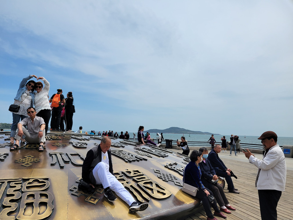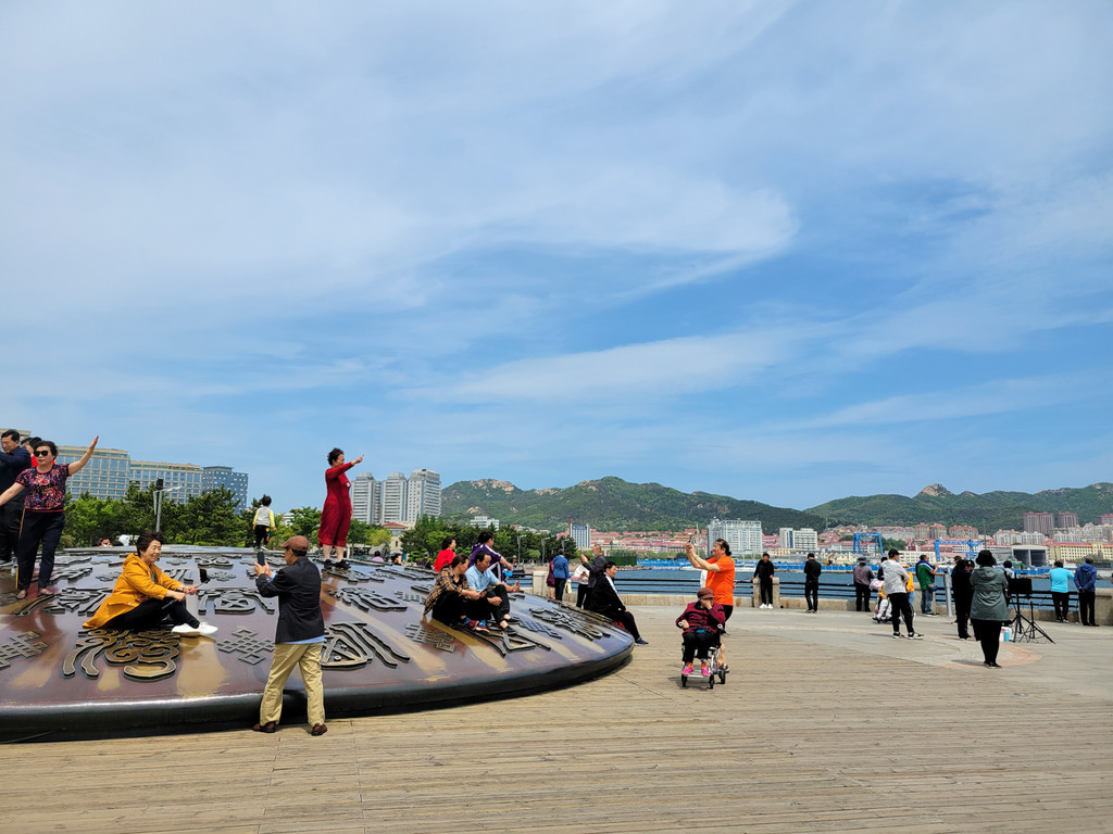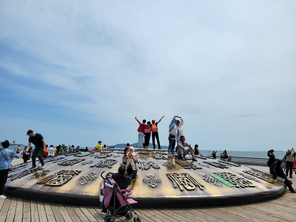 下到一楼之后,可以从幸福门下过(我把它称作“任意门”,感觉它能带我走向我想去到的地方),地面上有一个凸起的圆形锻铜建筑,称为"百福图"(我同事说她一直觉得这里是威海最适合穿越的地方哈哈,真是极其可爱有趣的一枚妹子呢!),高1.38米,直径13.8米,重13吨。排列成五圈的"福"字,寓意"五福临门"、"五福同享",这里是威海千公里幸福海岸线的起点,祝福人们在这里开启幸福之门。幸福门面海方向呈现出一片幸福祥和欢乐愉悦的休闲氛围,踩福、海边留念、直播歌唱、垂钓、看孩童嬉闹。。。你会轻松的融入其中,收获幸福和快乐!